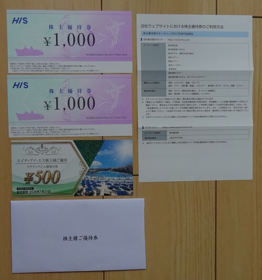 ①HISエイチアイエス 株主優待券1000円割引券×2枚