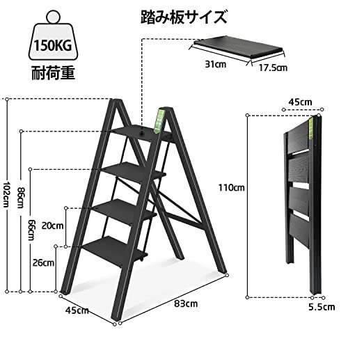 【素材】アルミ合金製。このはしごは高品質の素材で作られ、何回展開しても大丈夫です。最大使用荷重は150kgです。本体重量:約2.8kg。軽量で、女性や高齢者の方でも、簡単に持ち運びできます。