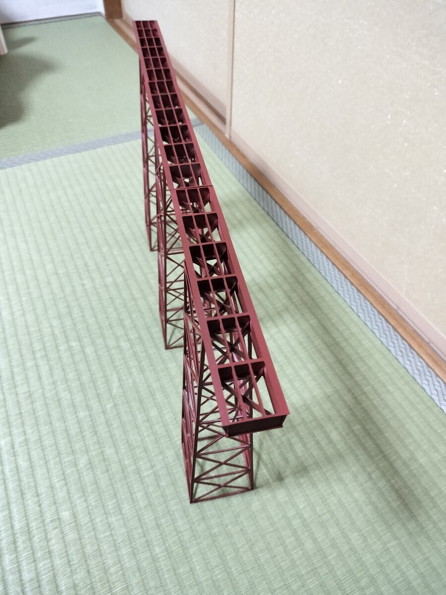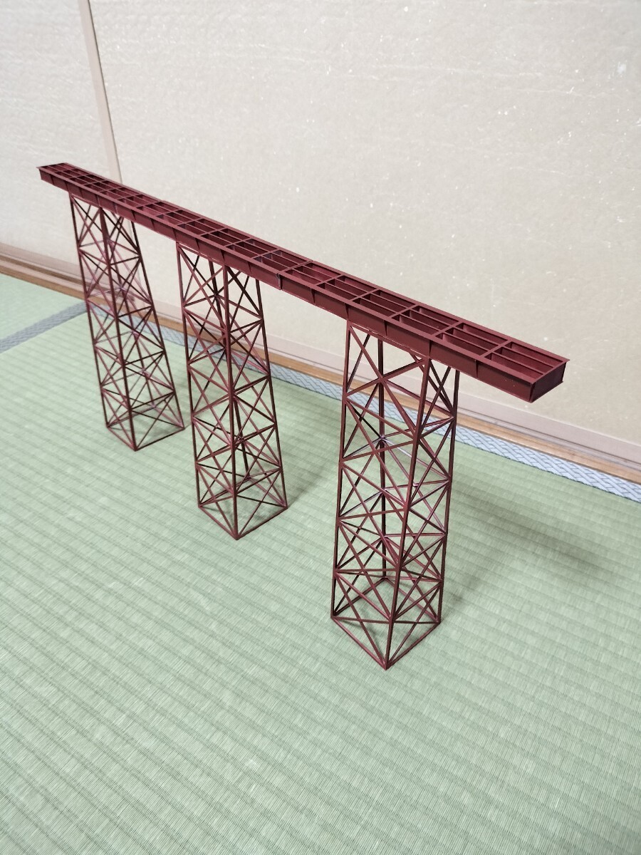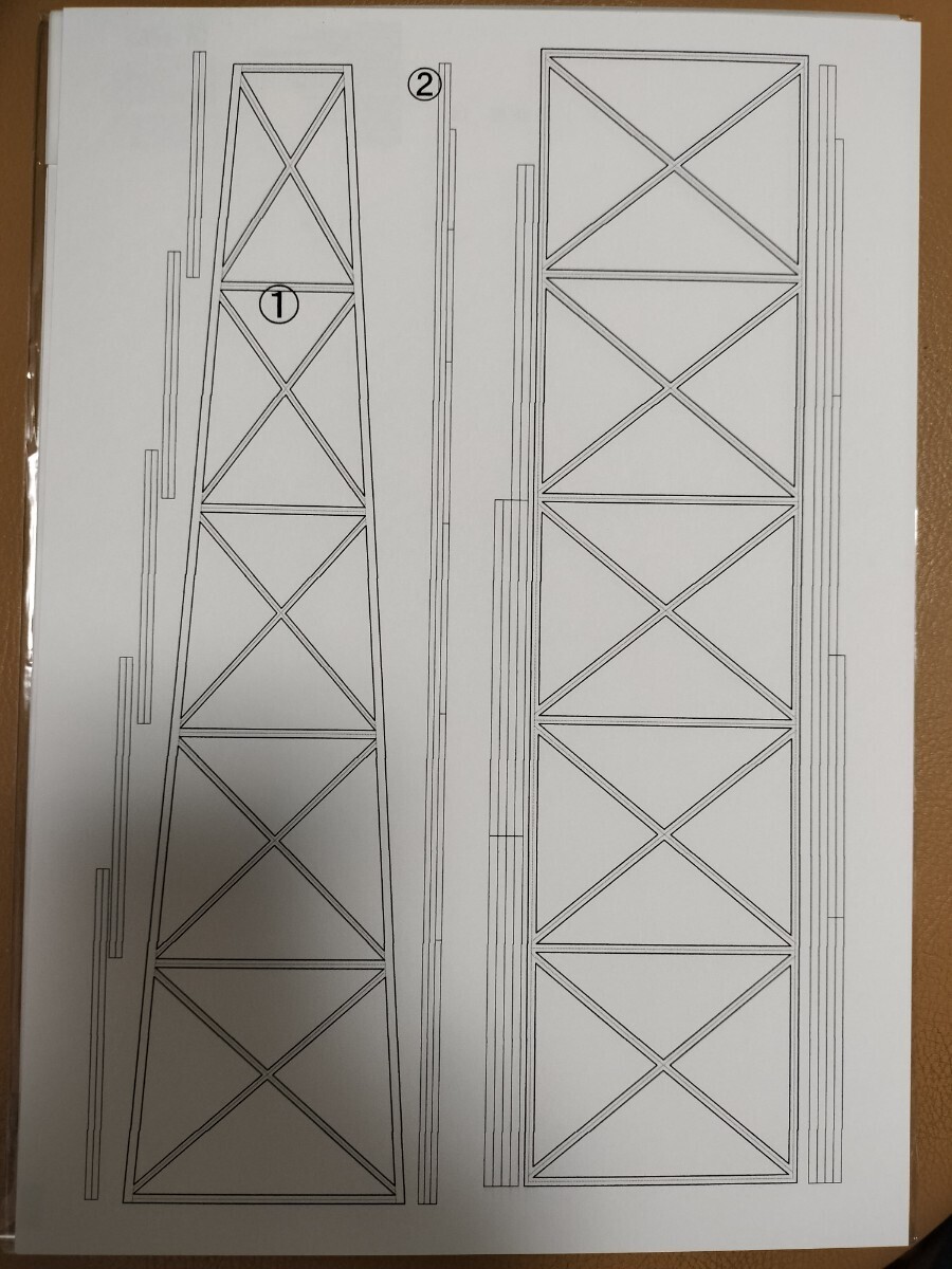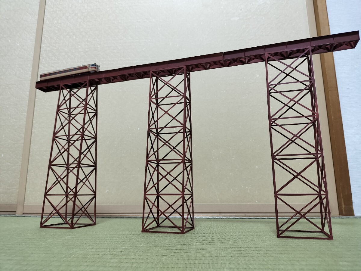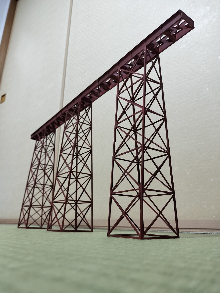 余部鉄橋風の1/150スケールの上級者向けペーパーキットです。写真の6枚目のようなものを、T字型やH型で組み合わせることで、上に車両を展示できるような強度を誇ります。組み立て、塗装をすると写真のようになります。尚、ミシン目などはございません。内容物としては、説明書と橋桁部3本分のパーツ・ガーター部3本分のパーツです。組立にはカッター・ボンド等が必要です。内容物を説明書通りに組むと、約15時間かかり、高さ約30センチ・長さ約60センチのものが出来上がります。ご不明点等ございましたら、お気軽にお尋ねください。個人制作のものなので、完璧を求める方はご遠慮ください。
