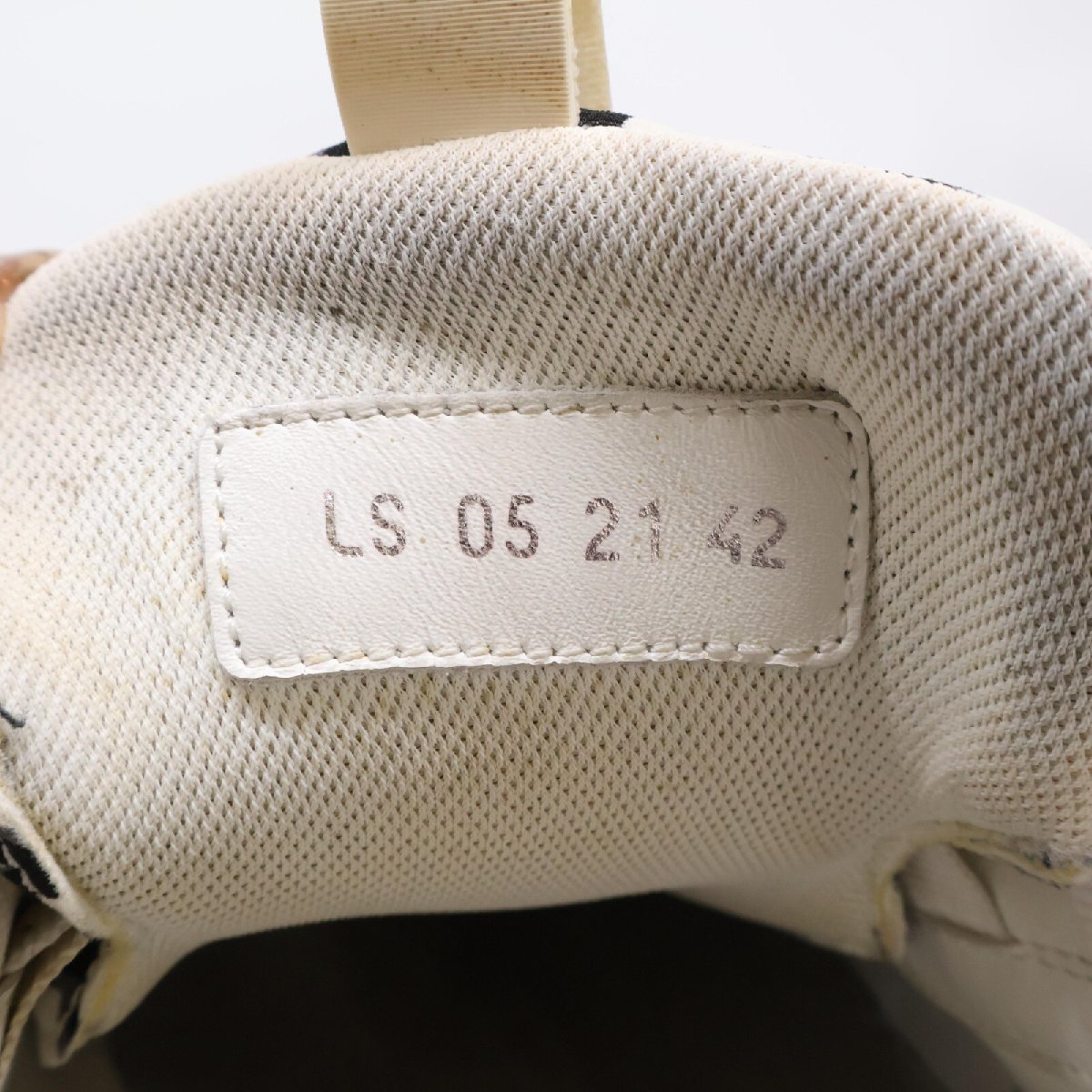 外側詳細:履きじわがございます。タンにシミ汚れがございます。プルストラップに汚れがございます。シューレースに黄ばみ、圧痕がございます。