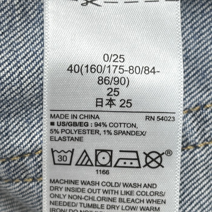 実寸サイズ | (タグ表記:25) ・裾幅15.5cm ・ウエスト64cm ・股上28cm ・股下59cm ・ヒップ88cm ・わたり幅28cm |