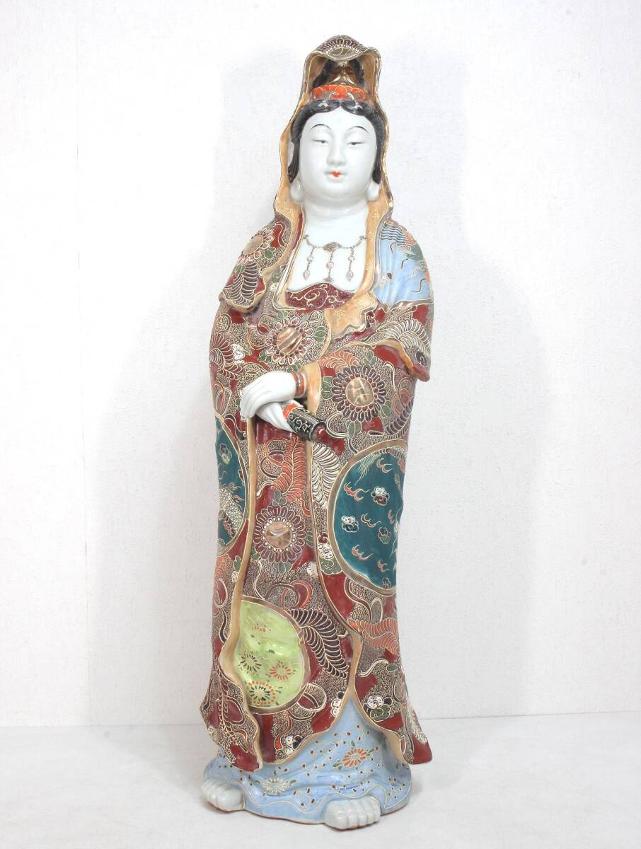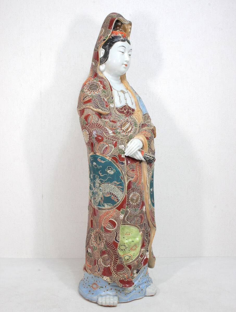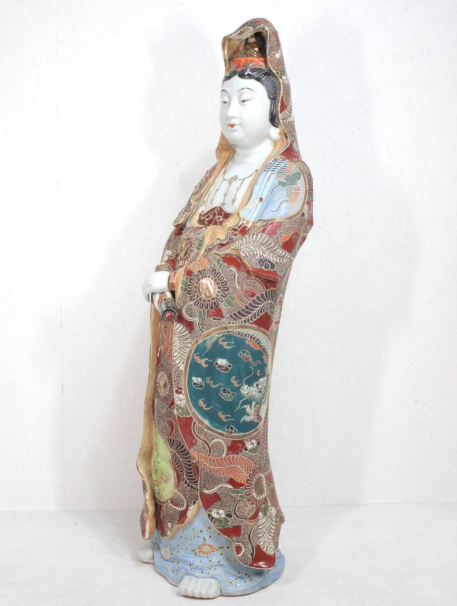 古九谷 九谷焼 金彩色絵 龍鳳凰花唐草細密盛上絵付 観音菩薩像 高さ約62.5cm 陶製 置物 仏像 仏教美術 古美術品