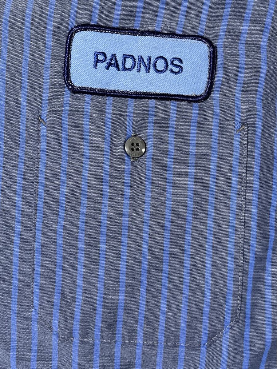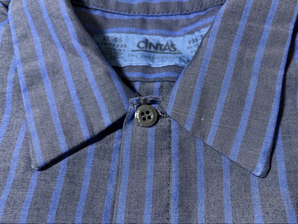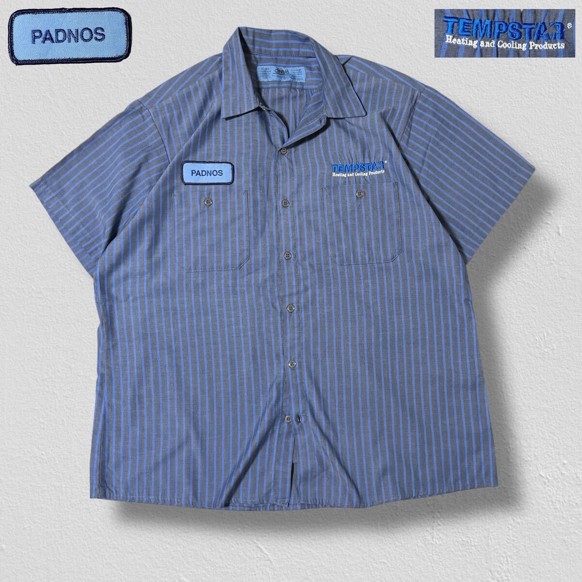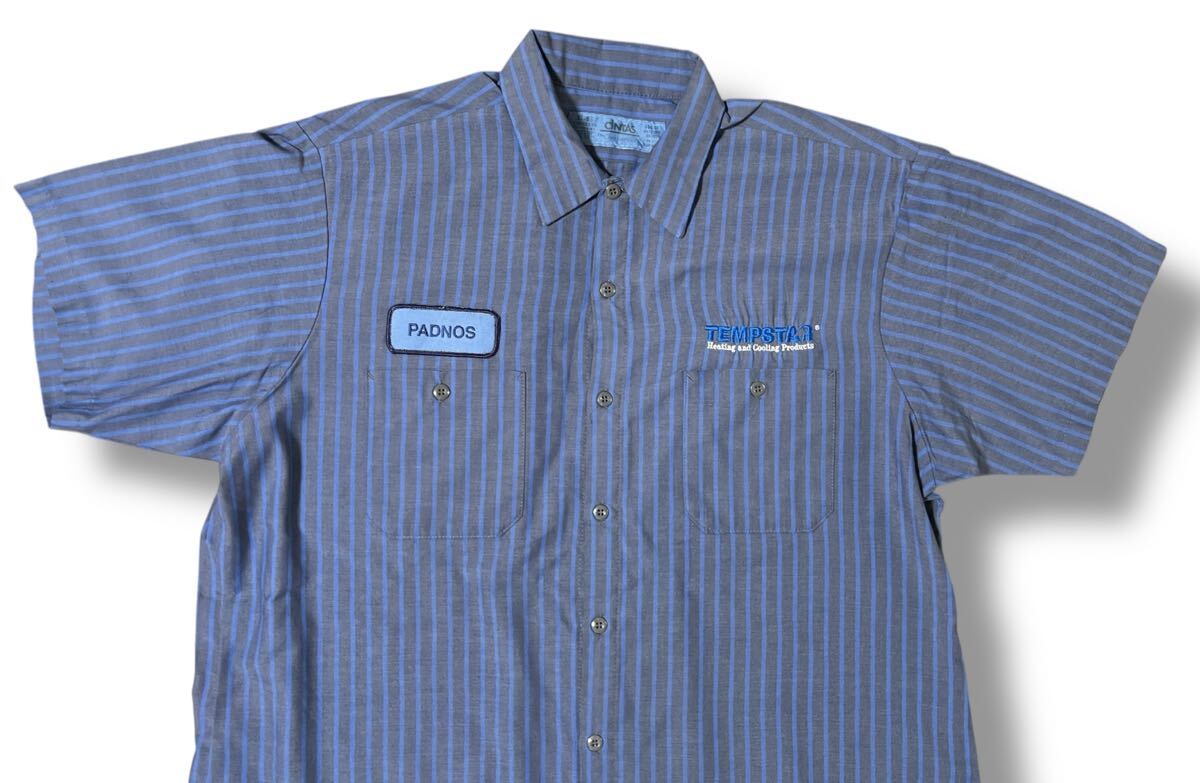 CINTAS 半袖ワークシャツ ワッペン 刺繍 TEMPSTAR PADNOS グレー×ブルーストライプ XL ●洗濯プレス済●ネコポス可● シンタス 古着/473