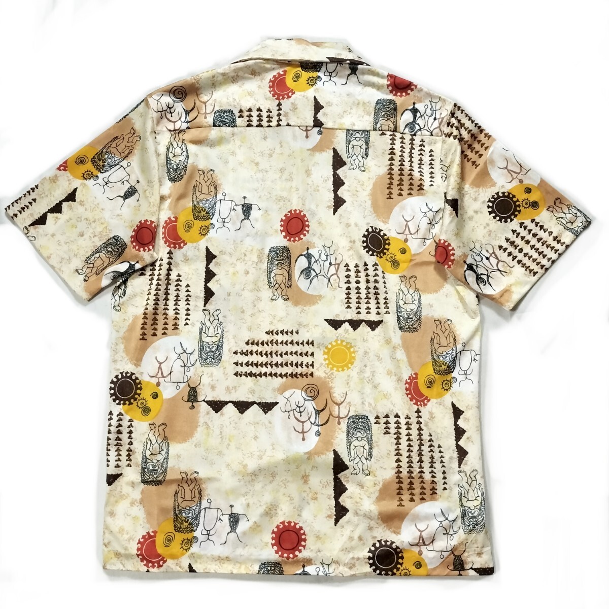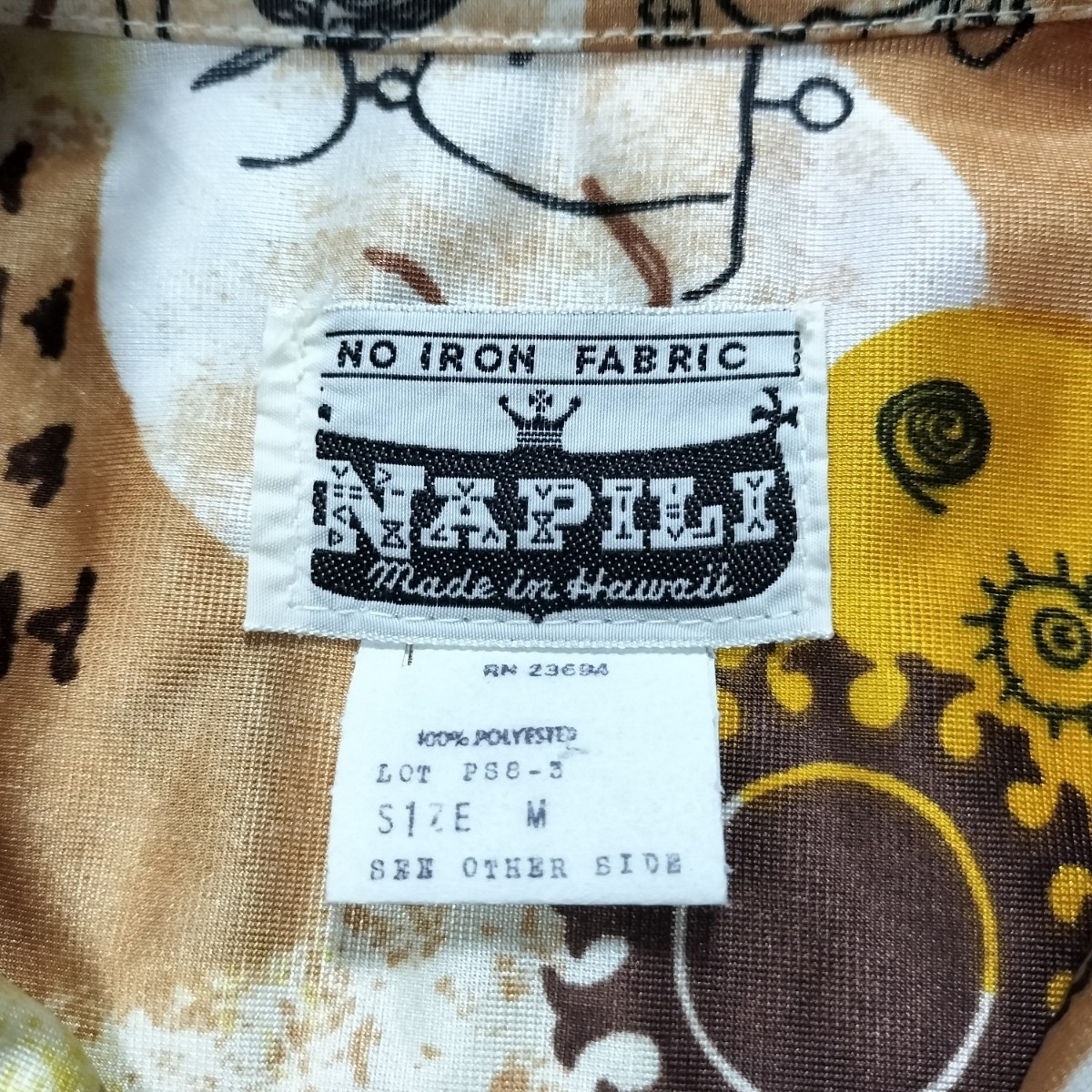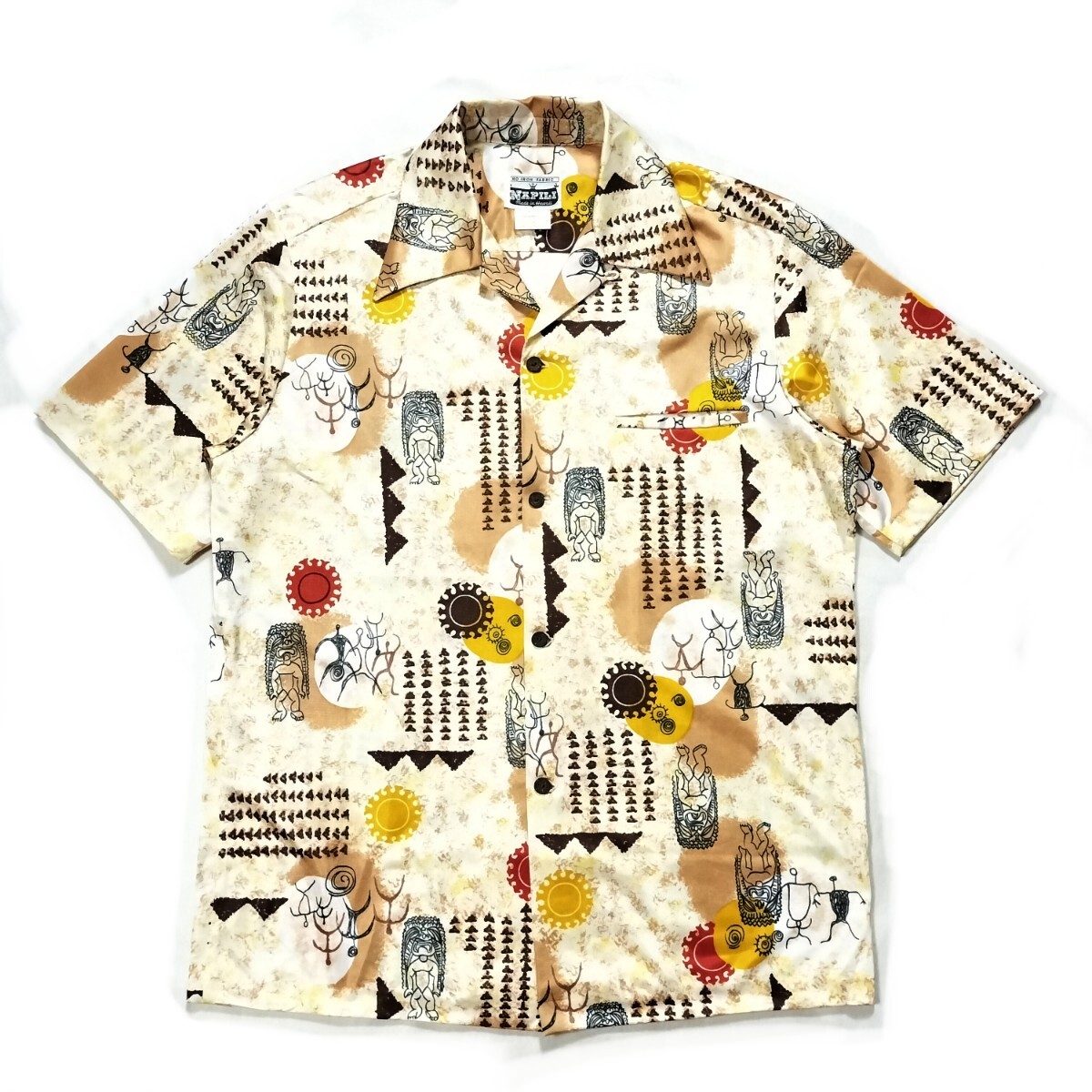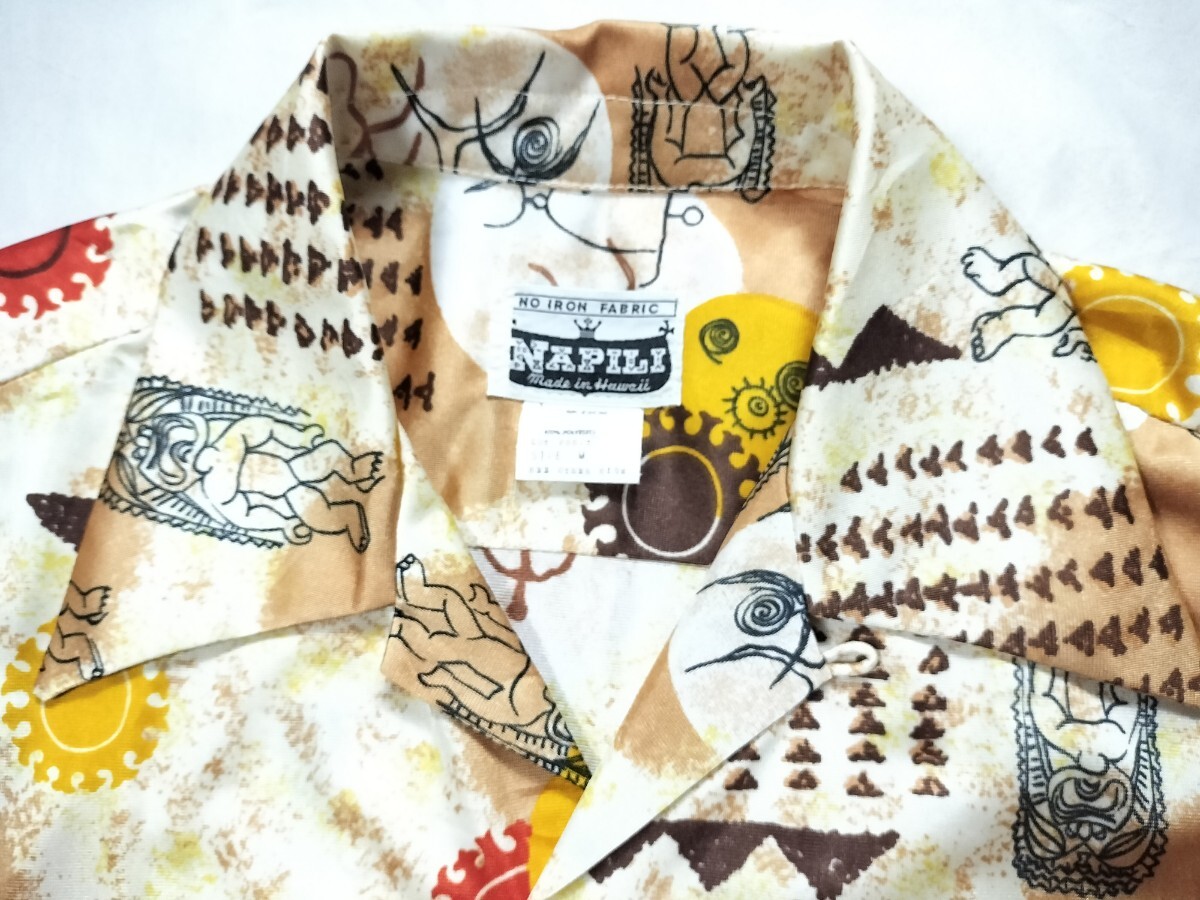 ほぼデッド 70s NAPILI アロハシャツ TIKI アトミック柄 ハワイ製 ブラウン クリーム ビンデージ オープンカラー