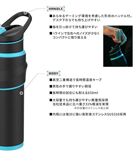 【おすすめ】 真空断熱 ゲーミングボトル ゲーム用 ボトル オンラインゲーム 650ml 水筒 ピーコック ストロー ステンレス
