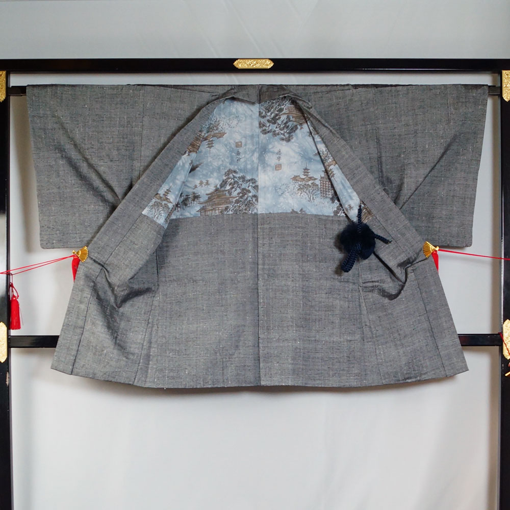 | 商品 説明 | 織節のあるふっくらとした真綿地を銀鼠色系無地に染め上げた紬の着物と羽織のアンサンブルです。羽裏は寺院模様です。 羽織紐も付いております。 |