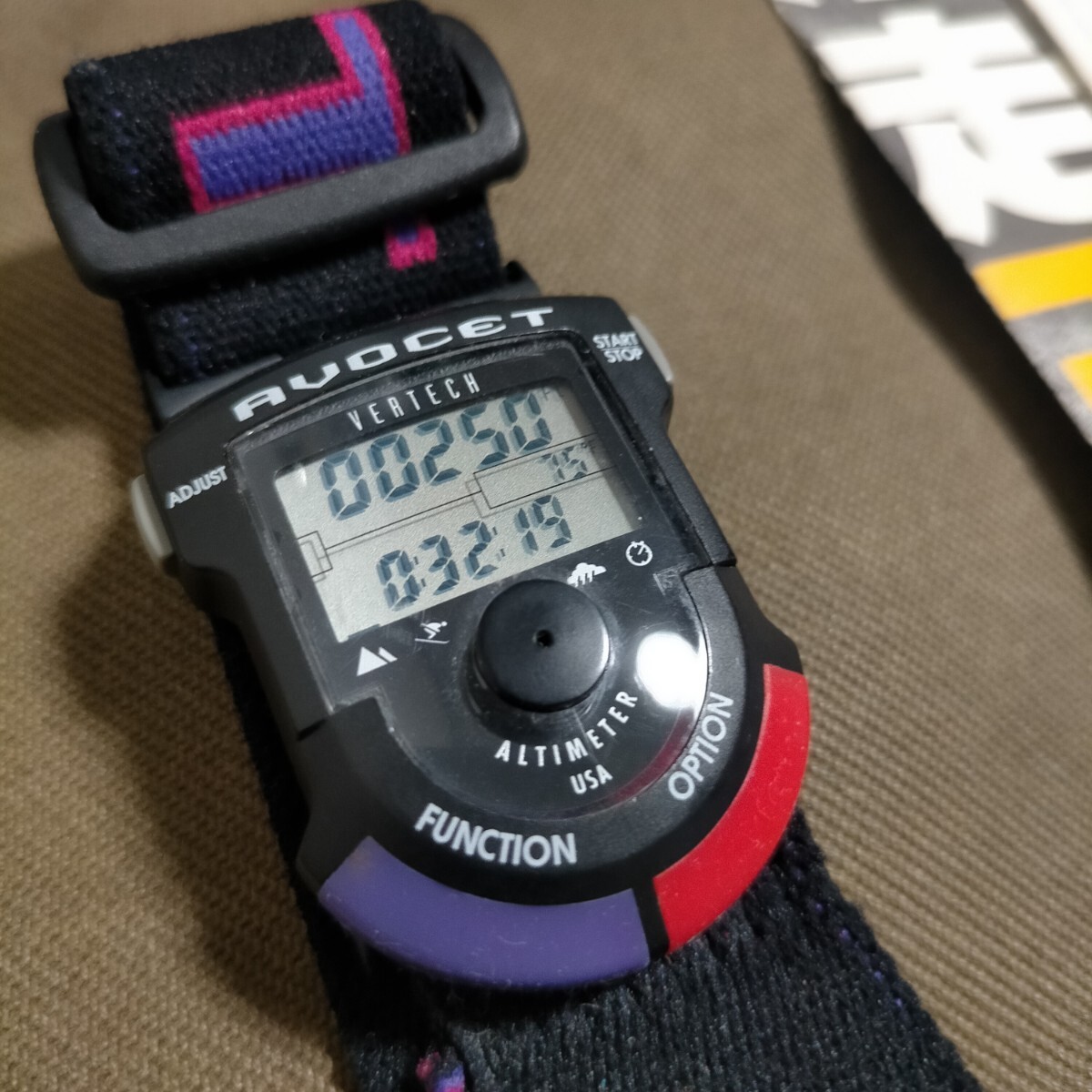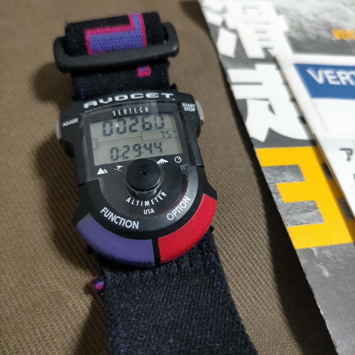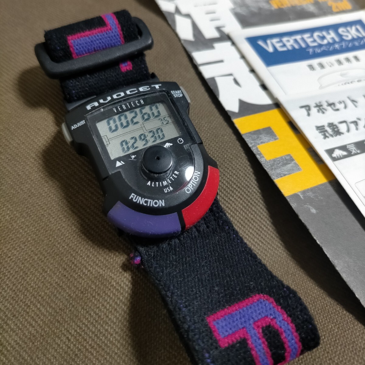 1996年に発売されたアメリカ・AVOCET社の名作VERTECHです。この時計は著名なインダストリアルデザイナーの深澤直人氏が89年のIDEO所属期にデザインしたことでも知られ近年再評価され価格も右肩上がりです。当時はスキーやスノボード以外にMTBレースでプロが実際にこちらのモデルを使用していたそうです。AVOCETは自転車のサドルや小物の販売がメインだったので当然といえば当然ですが。私は個人的にオールドMTBに最も似合う時計の1つでキャンプや登山などアウトドアシーン全般で映えるアイテムだと思います。色違い含めてこの5年間位ずっと探してますが、状態良いものは早々見つからないのが実情です。