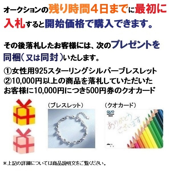 弊店ではオークションの残り時間4日までに最初に入札していただいたお客様に感謝の意を表し、開始価格以上で入札を行ったにもかかわらず落札できなかった方に対して、後日になりますが希望によりその開始価格と同額で同等商品(またはそれ以上の品質の商品)の落札を可能としています。(開始価格1円スタート商品を除く。)