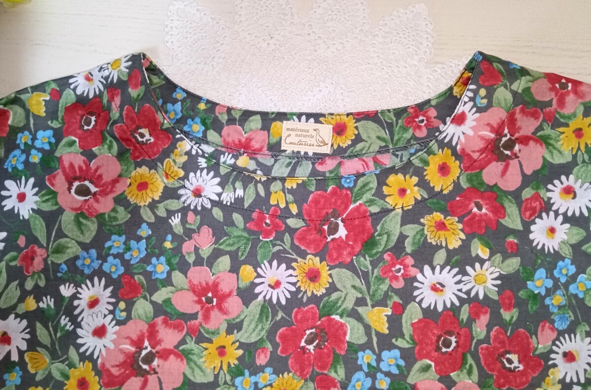 ・襟ぐりの見返しは共布で、後ろ見頃の目印にコットンタグを付けました。
