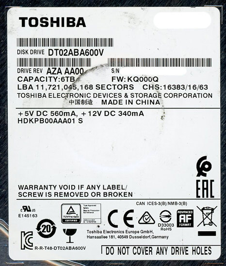 | TOSHIBA製HDD DT02ABA600V 6TB SATA600 5400 500~1000時間以内 | |