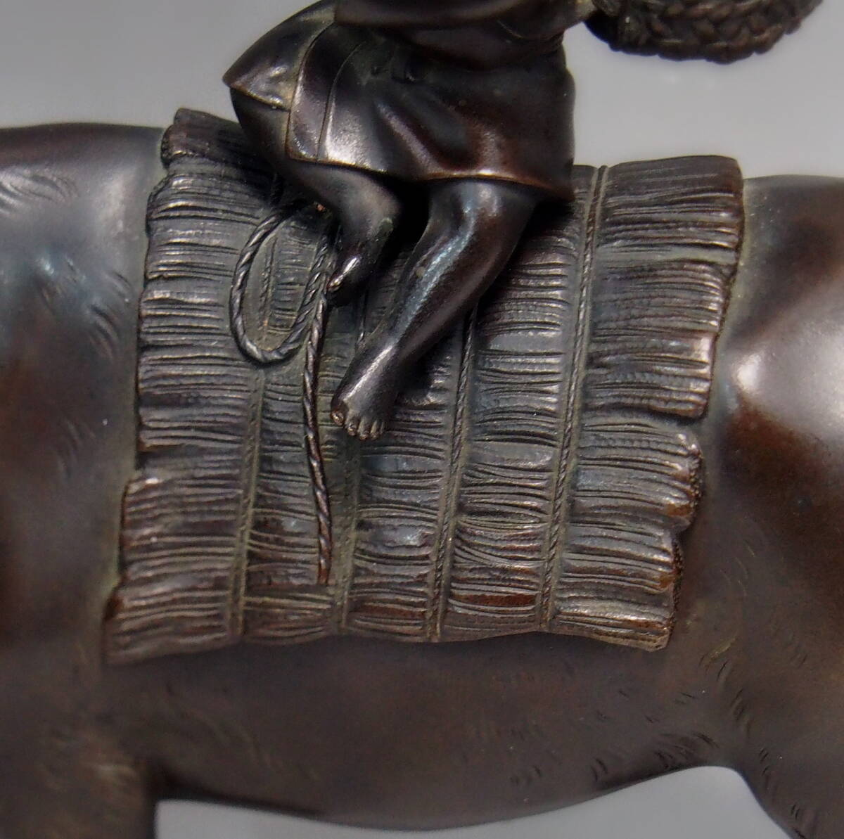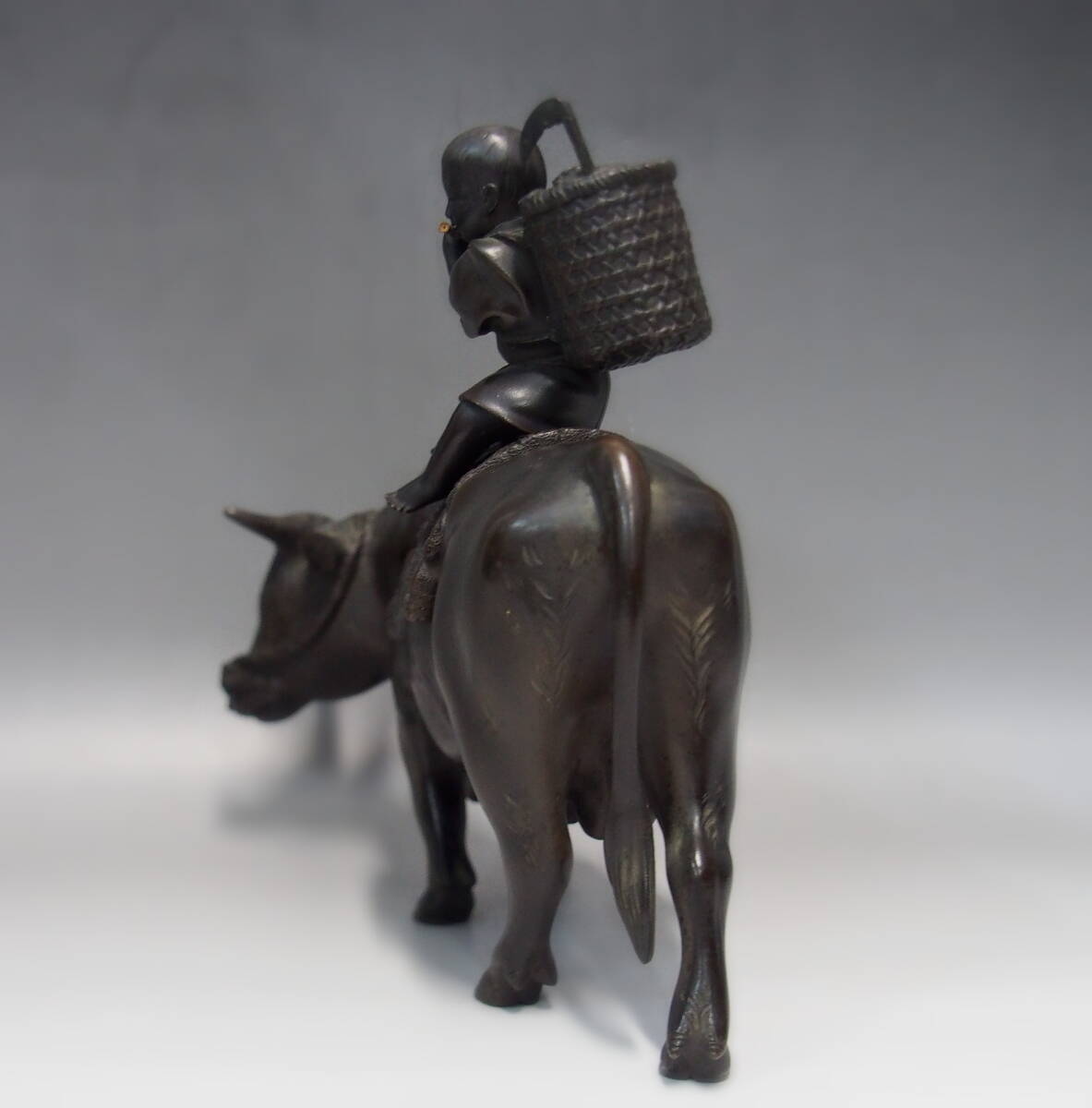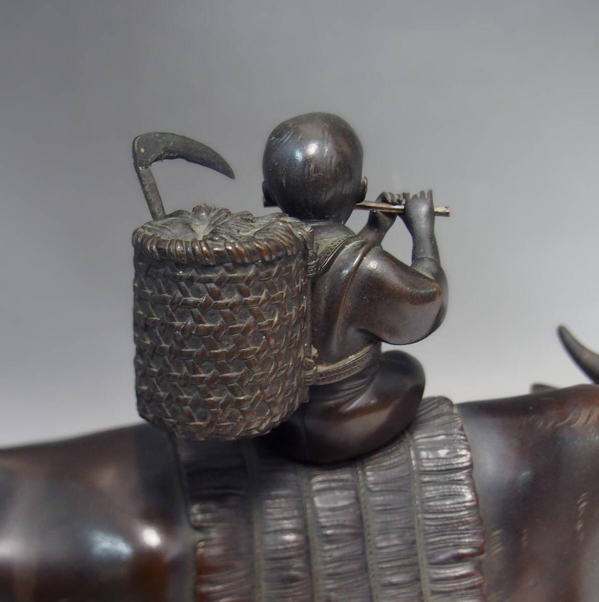 [禅] 時代金工 紫雲作 笛吹童子 古銅 騎牛帰家 十牛図 牧童 のったり 骨董 古美術 古賞物 細密彫刻 作家物 在銘 収集家 コレクター 銅器 牛