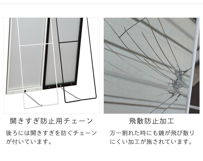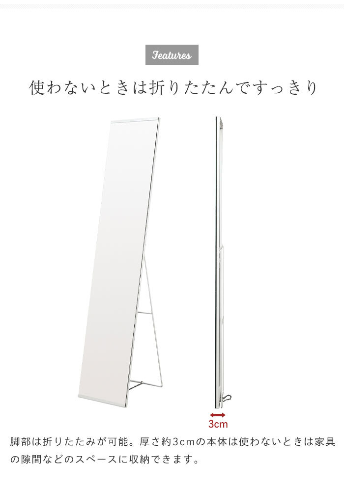 | スッキリとした印象で圧迫感がなく、お部屋を広く見せる効果のあるノンフレームスタンドミラー。 ミラーは飛散防止加工が施されているので、万が一強い衝撃が加わったとしても破片が飛び散らないので安心です。 使わない時は折りたたんで家具のすき間などに収納できるので邪魔になりません。 どんなお部屋にも馴染むホワイトカラー。 |