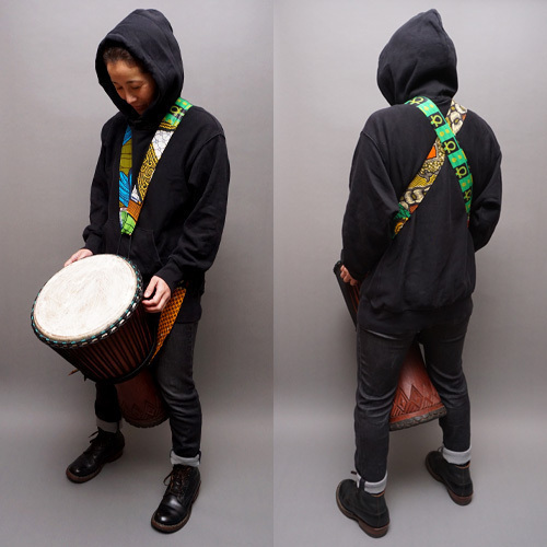 ナイロンベルトにアフリカンワックスで化粧をしたジェンベストラップです。