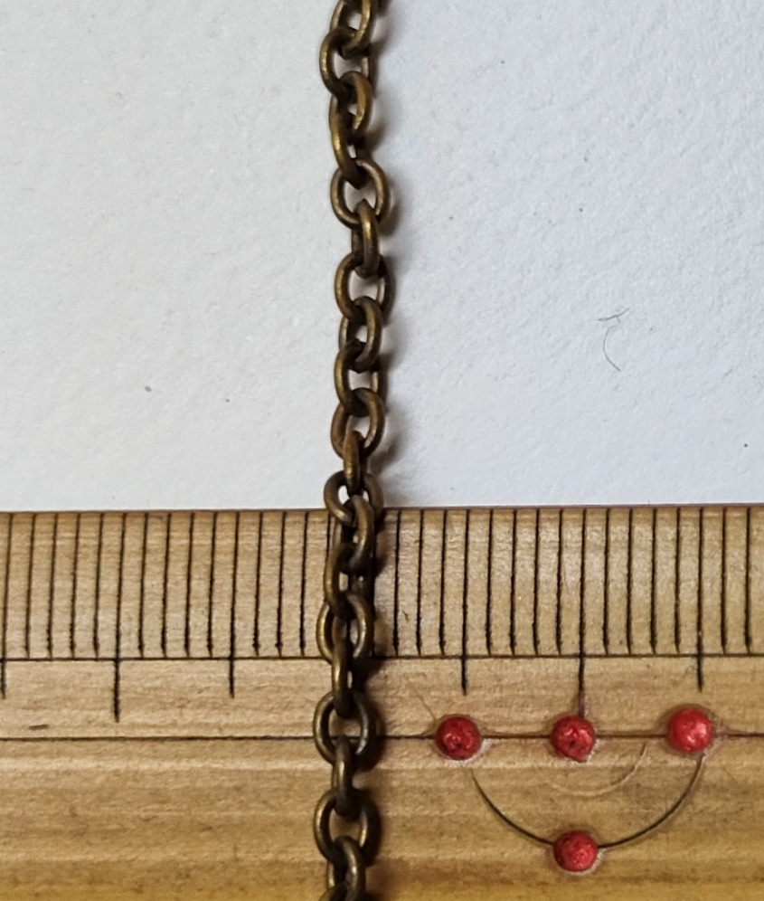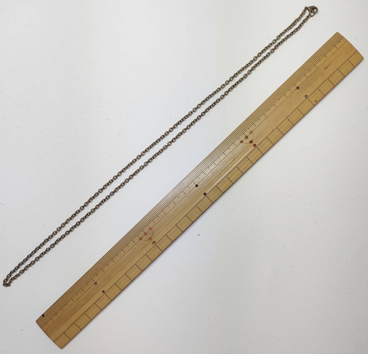 全長60㎝、チェーン幅2.5mm、線径0.5mm、カニカンに接続する丸カンの直径は5mmです。