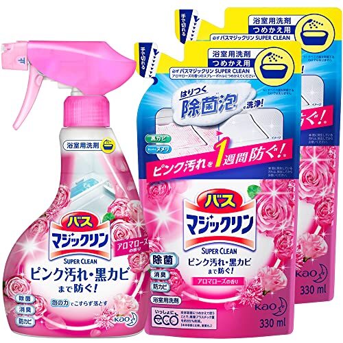 豊かな泡が湯アカや石鹸カスをしっかり落とすのはもちろん、菌に直接働きかけることで、菌由来のヌメリやピンク汚れ、黒カビの発生も防ぐ。 水をかけると泡がサッと消えてすすぎが早いから、時短・節水。 華やかなアロマローズの香り。