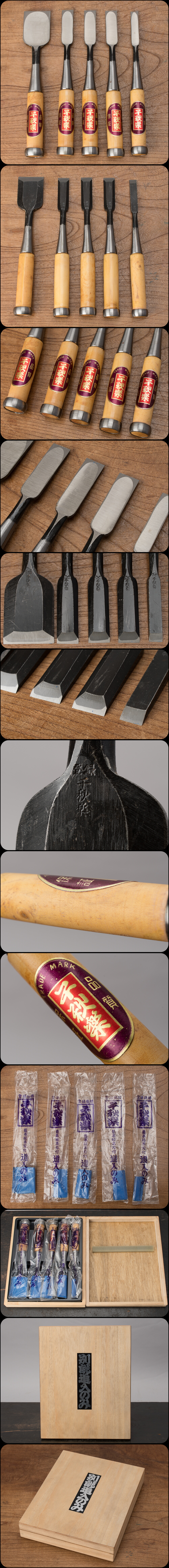 | 千秋楽の鑿5本。木箱有。 サイズは、大・刃幅約42mm、長さ約22.5cm。 小・刃幅約11mm、長さ約22cm。 状態・詳細は、画像でご確認お願いいたします。 |