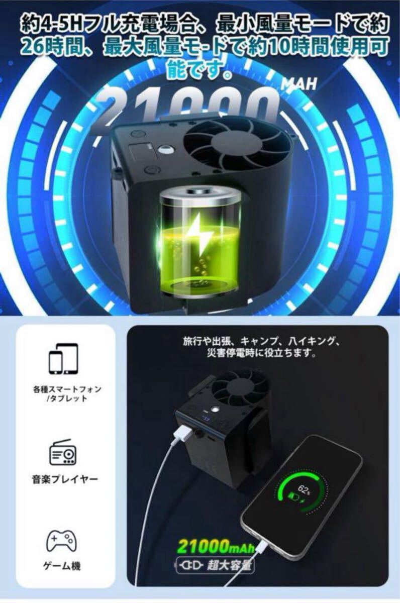 【21000mAh大容量&超長航】PSE認証済みバッテリーで、フル充電時には約10~26時間の連続運転が可能です。アウトドア作業や電源のない環境でも、一日中冷風を届けて安心です。スマホやタブレットの充電にも対応し、災害や停電など非常時の電力確保にも役立つ。