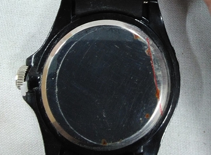 本体にはスレやキズ、裏蓋部分にサビがあります。ベルトにも使用感があります。