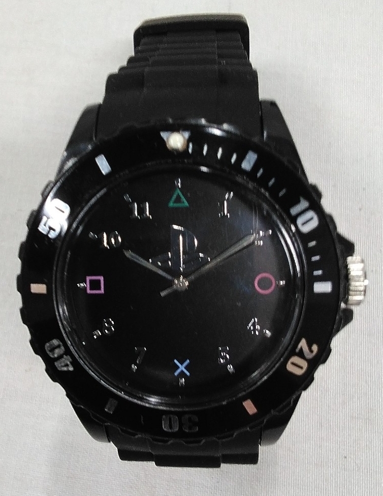 PlayStation(プレイステーション)ロゴ入りの腕時計です。ブラック カラ−の本体で、文字盤にはおなじみの ◯△□のマ−クがデザインされています。