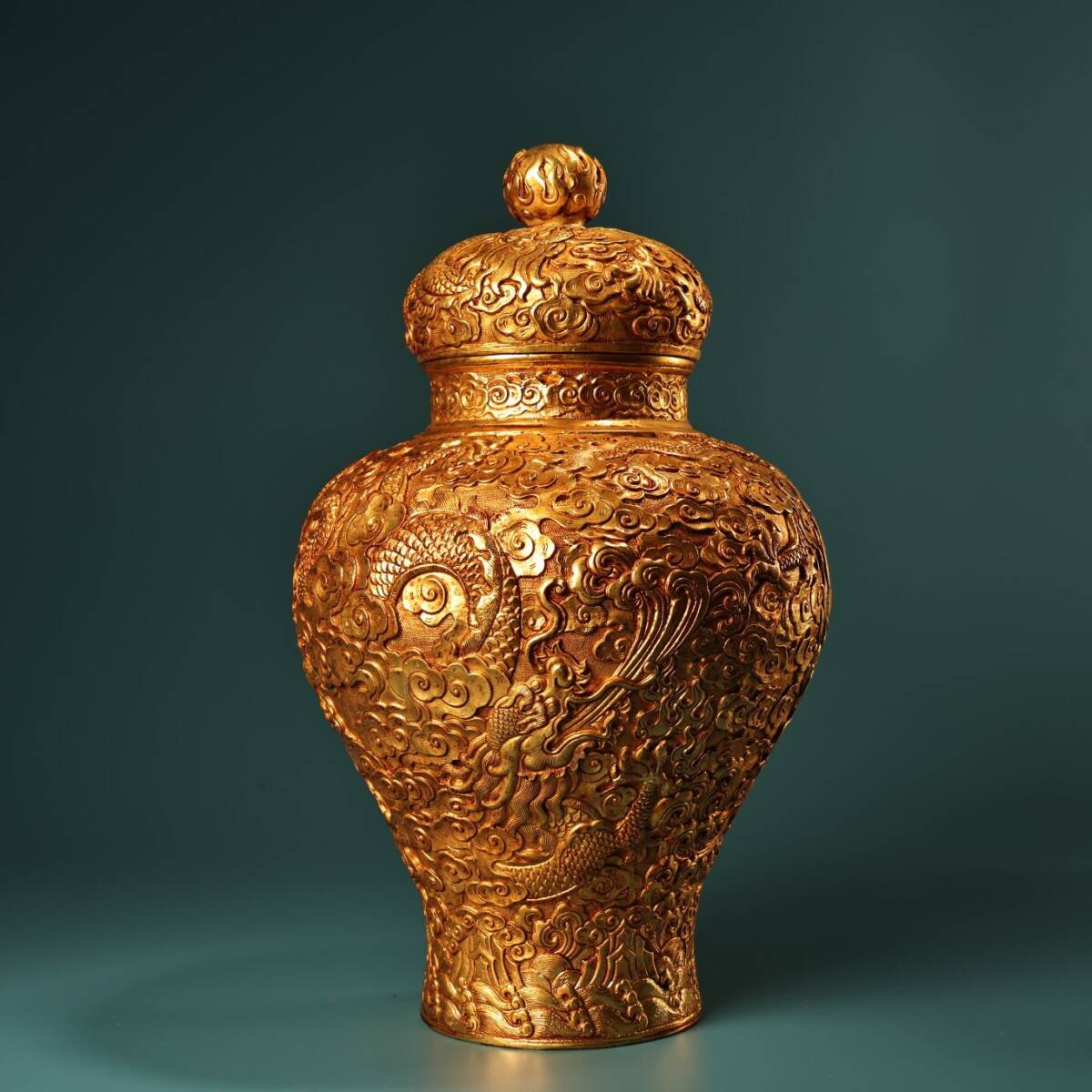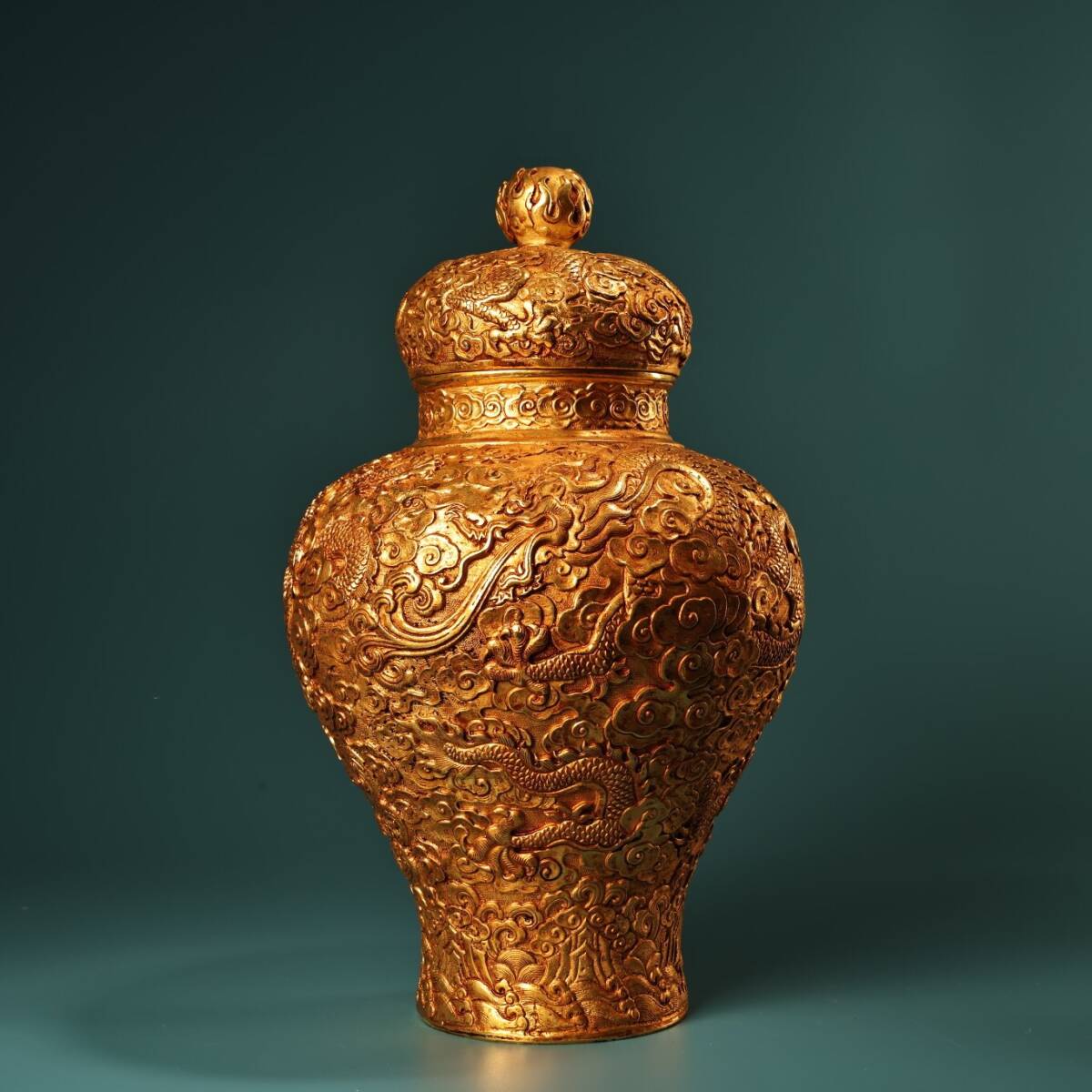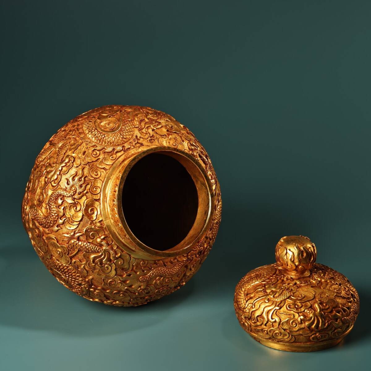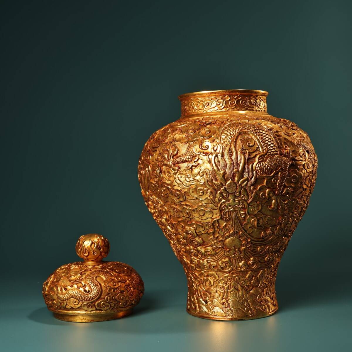 【超珍館蔵】銅製 塗金 九龍紋 將軍罐 置物 賞物 古賞物 古董品 古美術品 時代物 旧家蔵出 稀少珍蔵品
