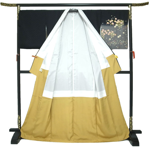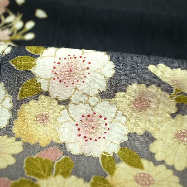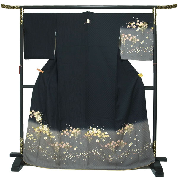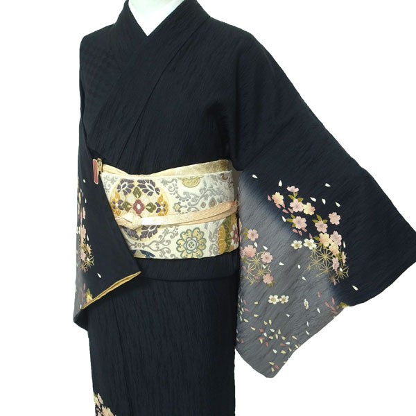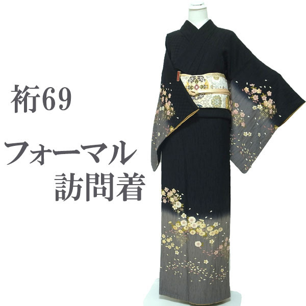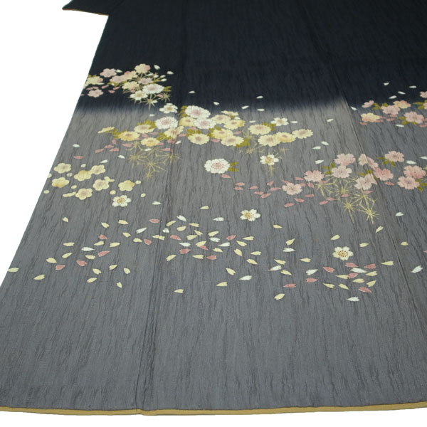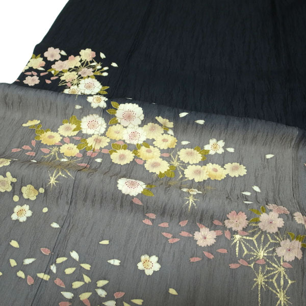 訪問着 着物 袷 手染め 地紋 片身替わり 黒 灰色 桜 菊 梅 麻の葉 金彩加工 ハイテクミシン仕立て 胴裏 ポリエステル フォーマル 結婚式 七五三 入卒式 入学式 卒業式 正絹 絹 なごみ 身丈167.5 裄69 Lサイズ 中古 仕立て上がり品 sn1650