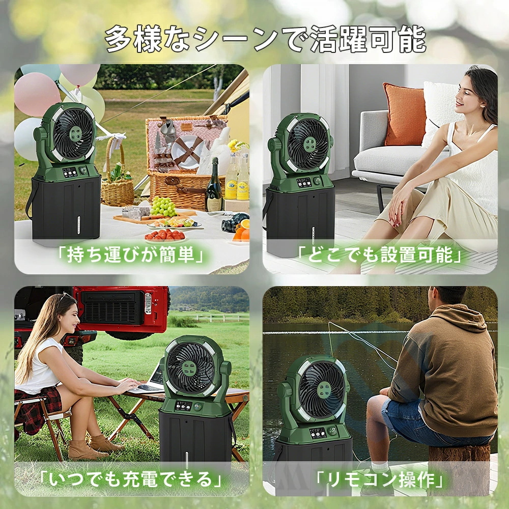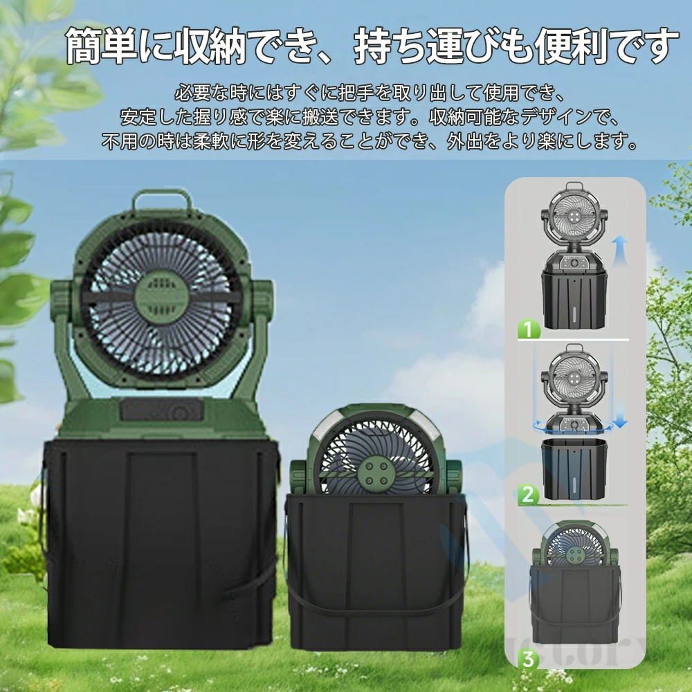 【新型ミスト扇風機&6L大容量水タンク】 従来のキャンプ用扇風機と比べ、新たにアップグレードしたミスト機能は、風を送りながら肌に涼しい微細な水霧を感じさせます。細かいミストが夏の高温環境で素早く蒸発し、お肌に涼しさをもたらします。充電式ポータブルファンには大容量6L水タンクを装備。満水時には5~9時間の長時間使用が可能で、頻繁な水補給の必要がありません。使用しない時は本体を折りたたんでバッグ内に収納可能。コンパクトにまとまるため、アウトドア旅行にも直接持ち運びに便利です。