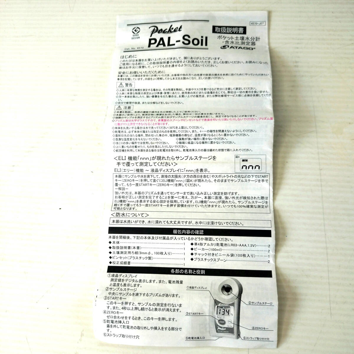 | 商品説明 | ■入札前に必ず注意事項をお読みの上にてお願い致します。 ■ポケット土壌水分計・含水比測定器■PAL-Soil■農業.地質調査■丸洗OK■土木・建築・農業・園芸 ■仕様 ・機種名 : PAL-Soil ・目盛の種類 : 含水比 体積含水率 温度 ・測定範囲 : 含水比:0~200% 体積含水率:0~100% 温度:10.0~40.0℃ ・分解能 : 含水比:1% 体積含水率:1% 温度:0.1℃ ・測定精度 : 含水比:±2%(含水比0~40%において)、 ±5%(含水比41~100%において) 温度:±1℃ ・温度補正範囲 : 10~40℃ ・使用環境温度 : 10~40℃ ・電源 : 単4アルカリ電池 2本 ・防水保護等級 : JIS-C0920 5級防噴流形 IEC規格529 IP65 ・寸法 : 55(W) × 31(D) × 109(H) mm ・重量 : 100g(本体のみ) ■綺麗な状態になります。 ■当方にて 動作確認済になります。 ■掲載商品 コンディション A ランク ■コンディション 表記 【N】⇒未使用品 。(未使用開封品も含む) 【S】⇒美品。極わずかに使用感・経年がある、非常に綺麗な品。 【A】⇒良品。使用感・経年は少しあるが、全体的に良好な印象を受ける品。 【B】⇒普通。使用感・経年は見受けられるが、通常使用において問題のない品。 【C】⇒大きなキズや汚れ・欠損箇所・軽い破損等は見受けられるが、通常使用に問題のない品。 【G】⇒現状渡し品。動作未確認品等。 【J】⇒ジャンク品。主要箇所に不具合の確認された品。 ■コンディションランクの基準は、検品時の主観となります。 ■付属品 ■お渡しする商品は写真掲載の状態が全てになります。 ■経年変化有 ■確認 ■掲載画像でご紹介しきれない(検品時に気が付かない) 経年劣化 によるキズ・スレ・傷み・汚れ錆 色あせ 他 落書 有 等があることがございます。 ■ノークレーム ノーリターン のご理解のある方お願いいたします。 |