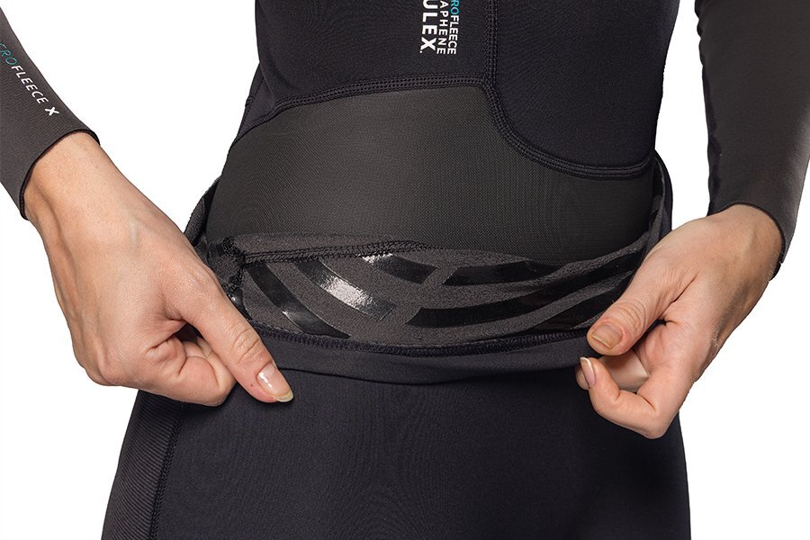 ![]() | 同シリーズのトップスとの組み合わせを想定したウエストデザイン。トップスとの重なる接合部(内側)には捲れ防止対策としてラバーペイントを使用。左大腿部横に小物入れポケット装備。 |