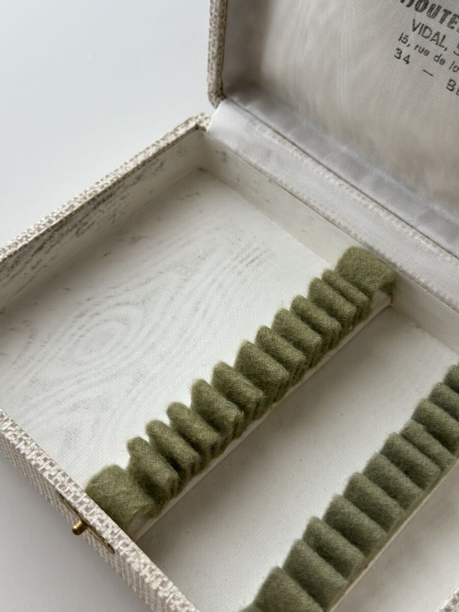 内部は 木箱をベースにした堅牢な造り。柔らかなグリーンのベルベット調仕切りとサテン張りの蓋裏が、大切なカトラリーを美しく収められるよう仕立てられています。蓋裏には「Bijouterie Pillon, Bziers」と販売店の名が記され、フランスの地方都市で愛用されてきた背景を物語ります。