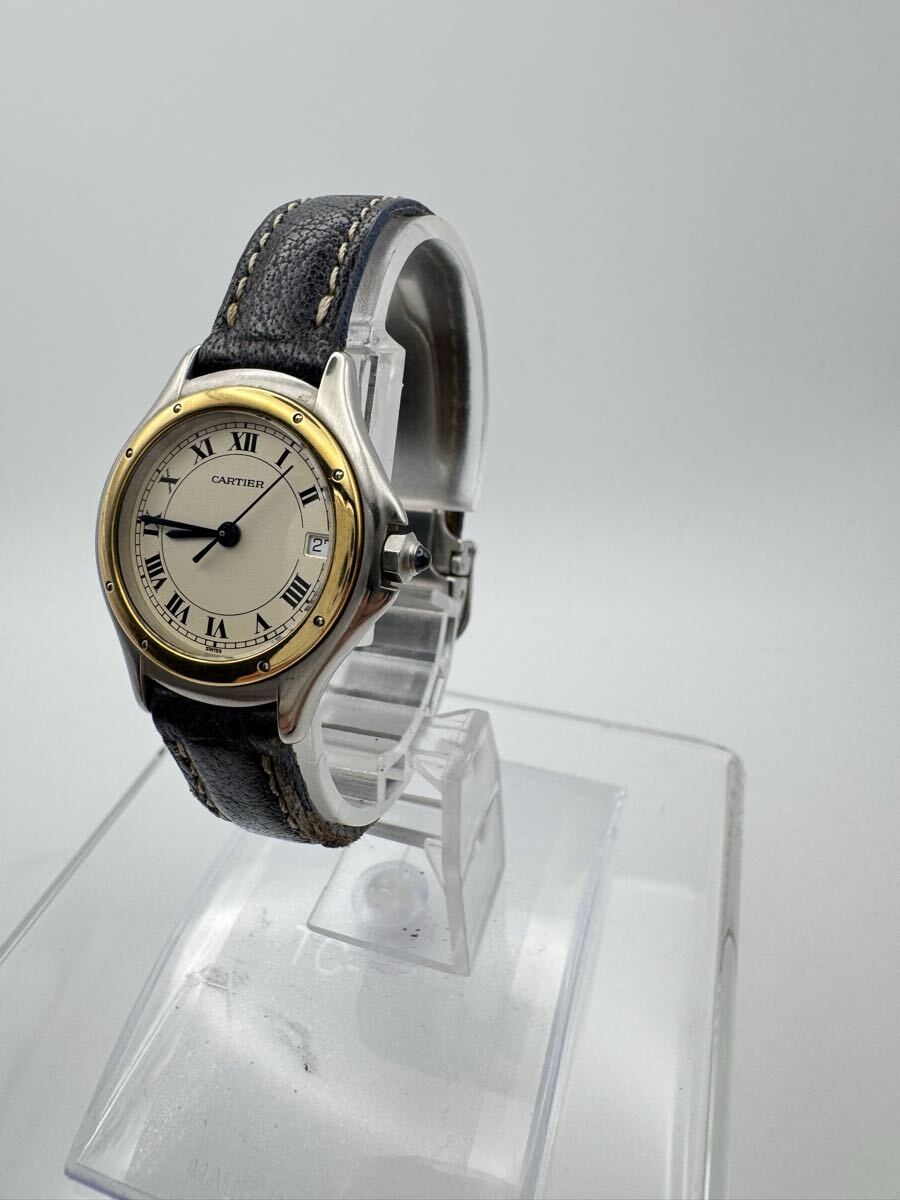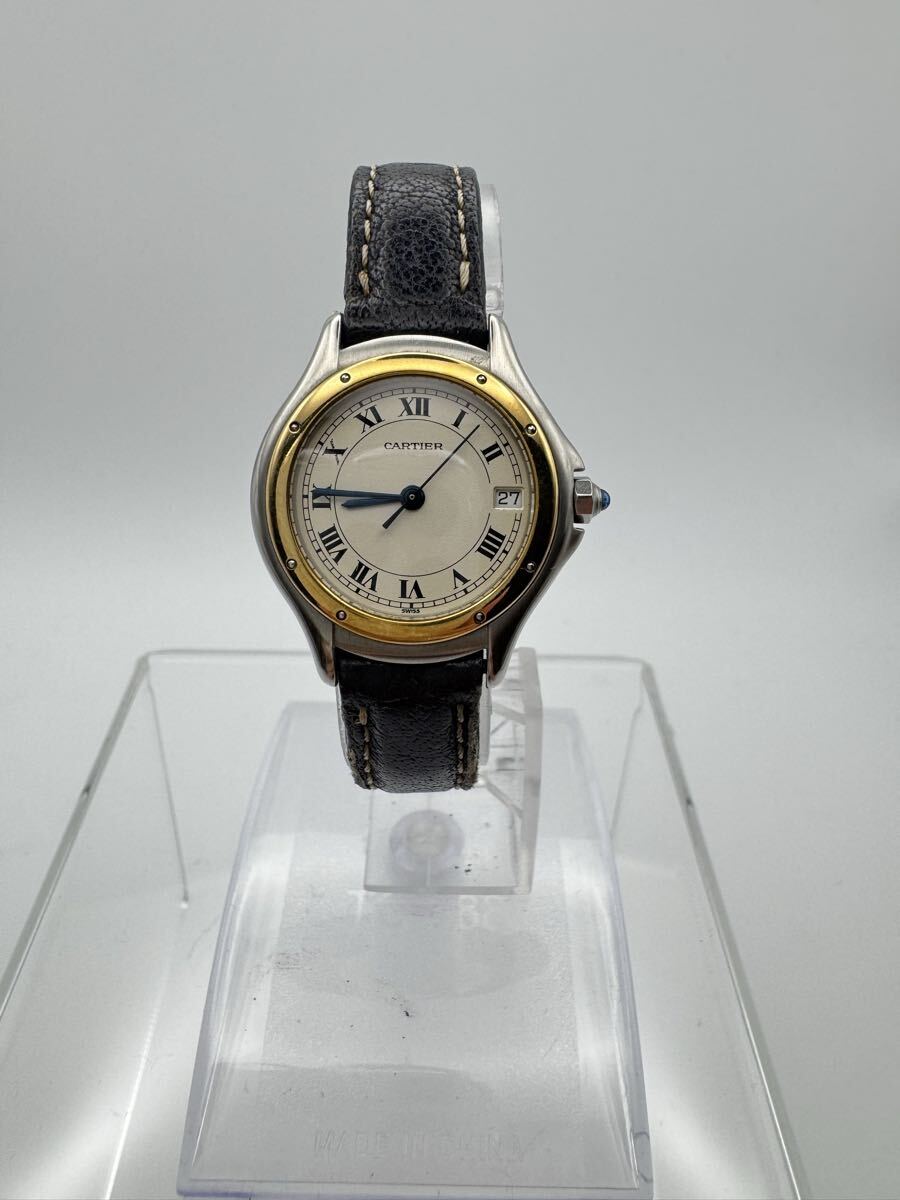 ラウンドフェイスにローマ数字インデックスを配した上品なデザイン。ゴールドベゼルとシルバーケースのコンビカラーが華やかさを引き立てます。3時位置には日付表示を搭載。ブルースチールの針やリューズのカボションがカルティエらしいエレガントなアクセントになっています。