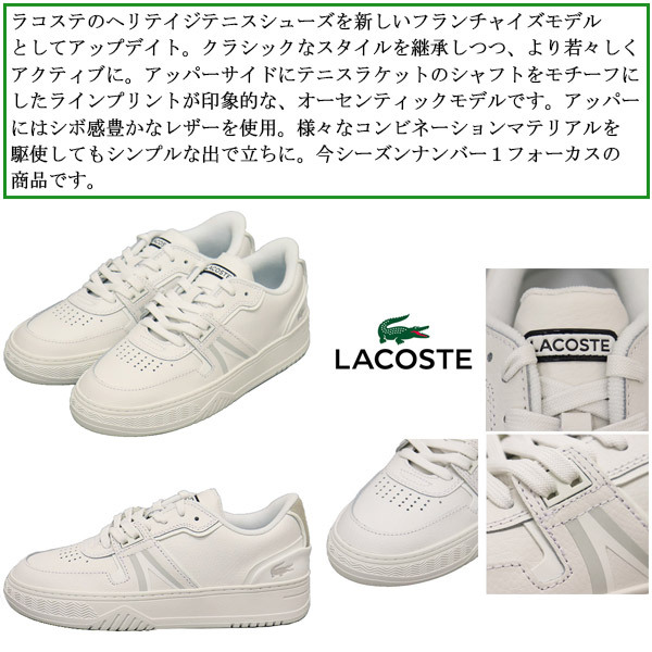 | スペック | ラコステのヘリテイジテニスシューズを新しいフランチャイズモデルとしてアップデイト。クラシックなスタイルを継承しつつ、より若々しくアクティブに。アッパーサイドにテニスラケットのシャフトをモチーフにしたラインプリントが印象的な、オーセンティックモデルです。アッパーにはシボ感豊かなレザーを使用。様々なコンビネーションマテリアルを駆使してもシンプルな出で立ちに。今シーズンナンバー1フォーカスの商品です。 |