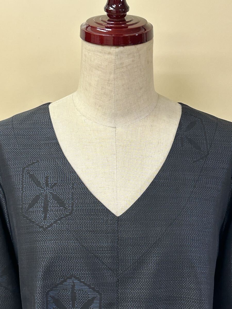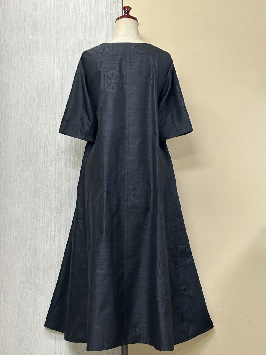 ★正絹、紬(躾付未使用)の着物より「半袖、Vネック、ロングフレアーワンピース」を作りました。