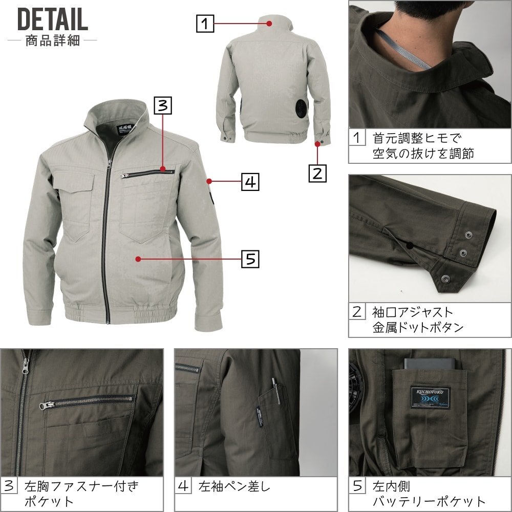 | 空調服説明 & 状態 & 素材 & サイズ & カラー 【画像参照】 | 届いてすぐにお使いいただけるおすすめセット商品! ■空調服 ≪説明≫ 現場服の2170.2270シリーズの空調タイプが登場。 上下セットアップでの着用も可能。 建設現場や鳶職人にもオススメ。 ≪状態≫ 新品・正規品 ≪素材≫ 綿100% 高密度ヘリンボーン ≪特徴≫ ・調整ヒモ ・左胸ファスナー付きポケット ・左胸二重ポケット ・フラップ付きポケット ・両脇ポケット ・左袖ペン差し ・左内側バッテリーポケット ・袖口アジャストボタン ・金属ボタン(ドットボタン) ・金属ファスナー ≪素材特徴≫ ・吸汗 ≪サイズ≫ タイトル名【 画像参照 】 ≪カラー≫ タイトル名【 画像参照 】 | セット 内容 | ■電池ボックス ≪内容≫ ・電池ボックス×1 出力:強(4.8V)、弱(2.4V)(2段階) 外寸:W65mm・D19mm・H85mm 連続使用時間 強(4.8V)設定時:約4時間 弱(2.4V)設定時:約16時間 エネループ2000mAh(単三4本)を使用した場合 ■ファンセット ≪カラー≫ タイトル名【 画像参照 】 ≪内容≫ ・ファン×2 ・ケーブル×1 ■:本商品の【 サイズ・カラー 一覧(服単品) 】 ■:本商品の【 ジャンパー・シャツ・パンツ 】 ■:本商品の【 フルセット(服+バッテリー+ファン) 】 ■:本商品の【 電池式セット(服+電池ボックス+ファン) 】 ■:本商品の【 ファンセット(服+ファン) 】 ■:本商品の【 備品 一覧 】 □:綿100% 空調服 一覧 □:ポリエステル100% 空調服 一覧 □:フルハーネス 空調服 一覧 |