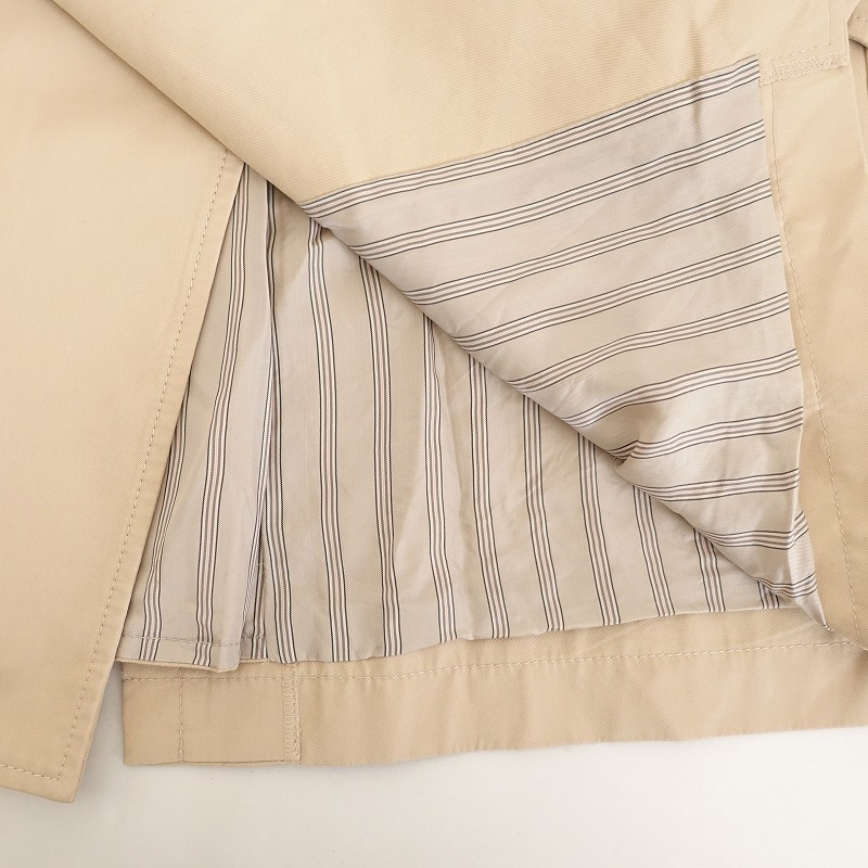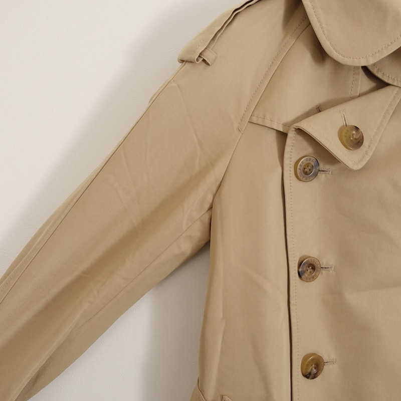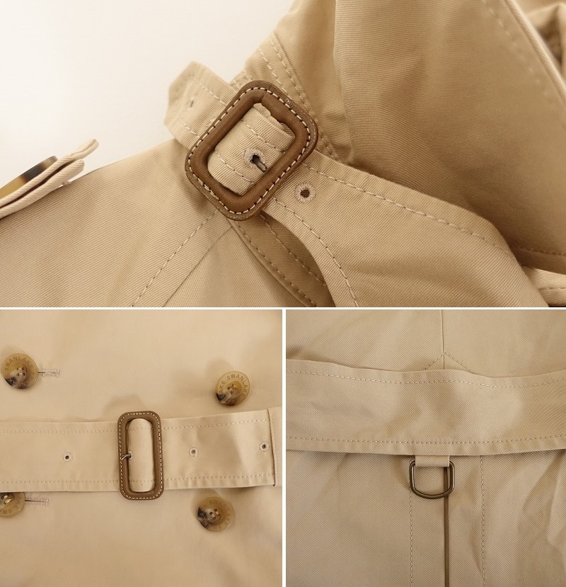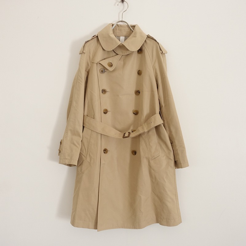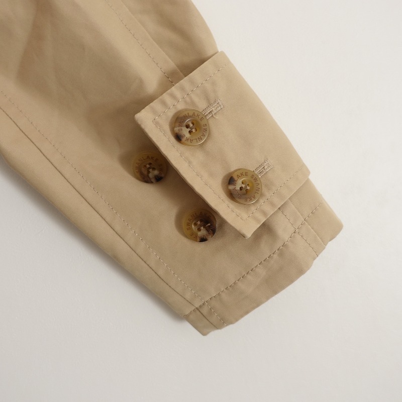 | SWANLAKEのトレンチコートです。カラーはベージュで、コットンブレンドのツイル地で仕立てられています。フロントはダブルのボタン開閉で、チンストラップやエポーレットの施されたデザインです。裏地付き、共布のベルトが附属しております。 |