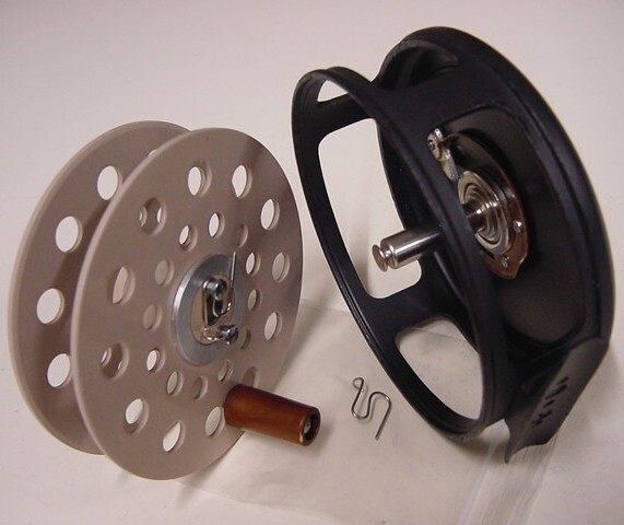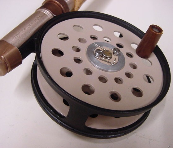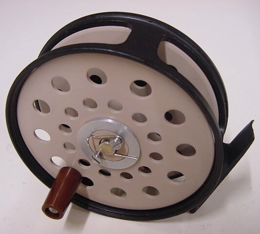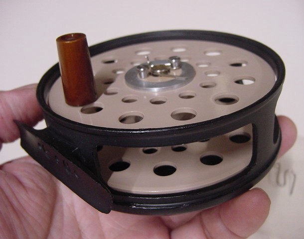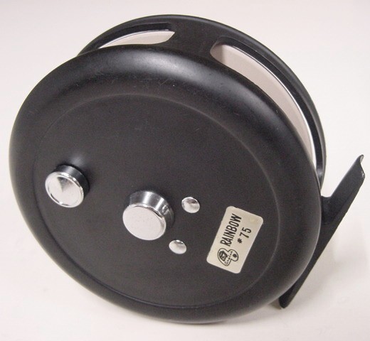 ■昭和40年代~、日工産業株式会社で製造された北米輸出用のフライリール、『ANGLER REEL RAINBOW #75』です。---★背面のラチェットブレーキとでラインコントロールします。完全シンメトリー構造で、完全シンメトリー構造で、左右どちら巻き側でも使用できます。マットブラック(ツヤ消し黒)のシェルにライト・クリームベイジのスプール、総アルミのツートンコンビ。オーソドックスなデザインながらレトロ感溢れる風貌。ビンテージ・グラスロッドに「似合いそうですね。::::■サイズ:::::自重=約210g、スプール外形=86mm、シェル外径=94mm::::::『本流用』大き目の部類で、適合ラインはバッキングで調整しつつ、#6、#7位。サイズも大き目なので、重厚でしっかりした造り。デザインもイケてます。
