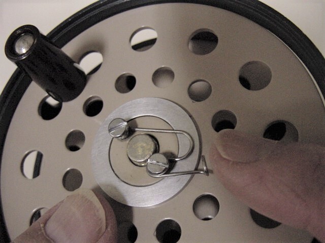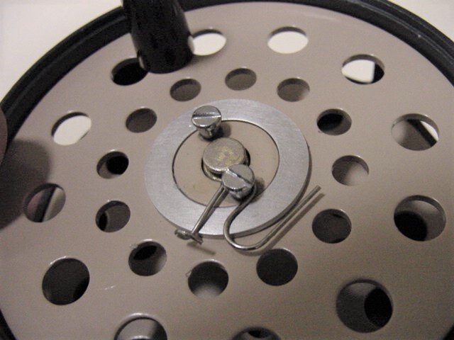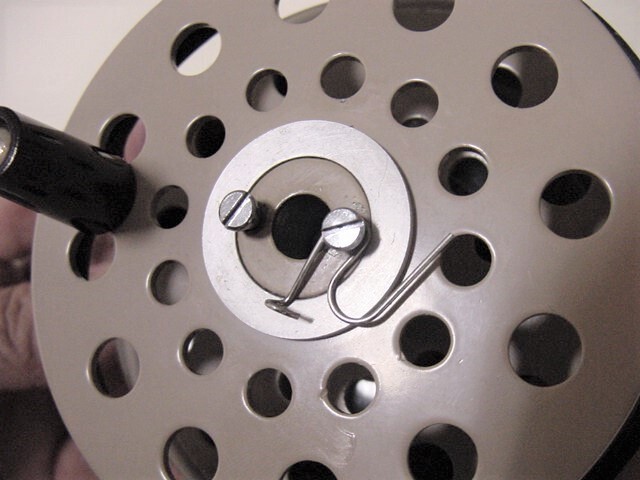 ●画像10>>これが金具が収まった状態で、このままで『半ロック』が効いた状態ですから抜けずに普通に使えますが、もし当分スプールを抜く必要がなければ、念のため金具の足先を少しキュッと曲げて絞めておけばより安心です。