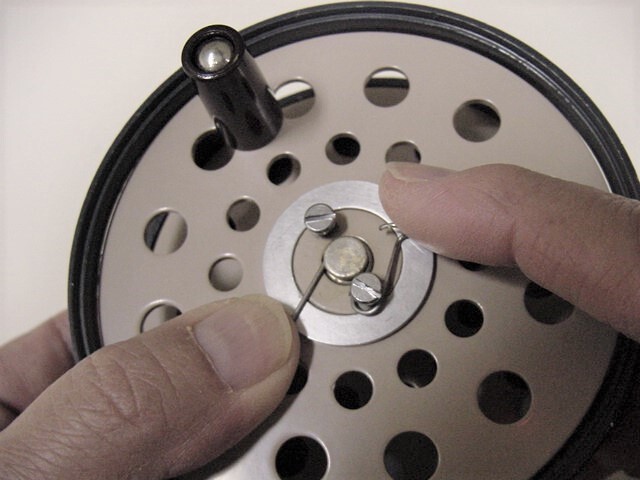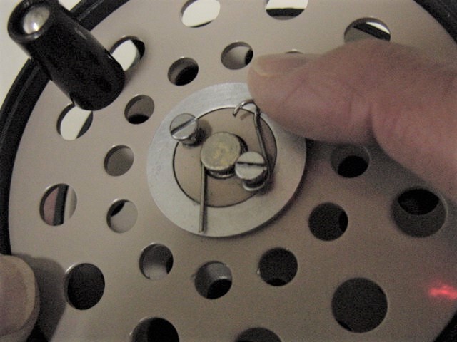 ●画像9>>外し方と逆の操作でスプールをはめるわけですが、スプールを軸にしっかり差し込み、金具の足先を軸のスリット溝に滑り込ませながら、金具の頭と足先を指で押さえつつ、キュッとこんどは左回転(半時計回り)に回して戻せば固定完了、スプールは抜けません。