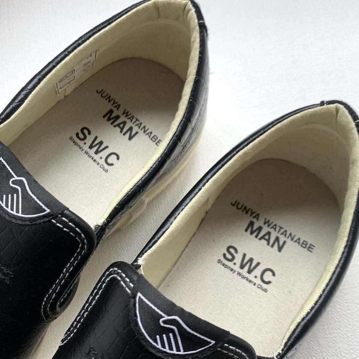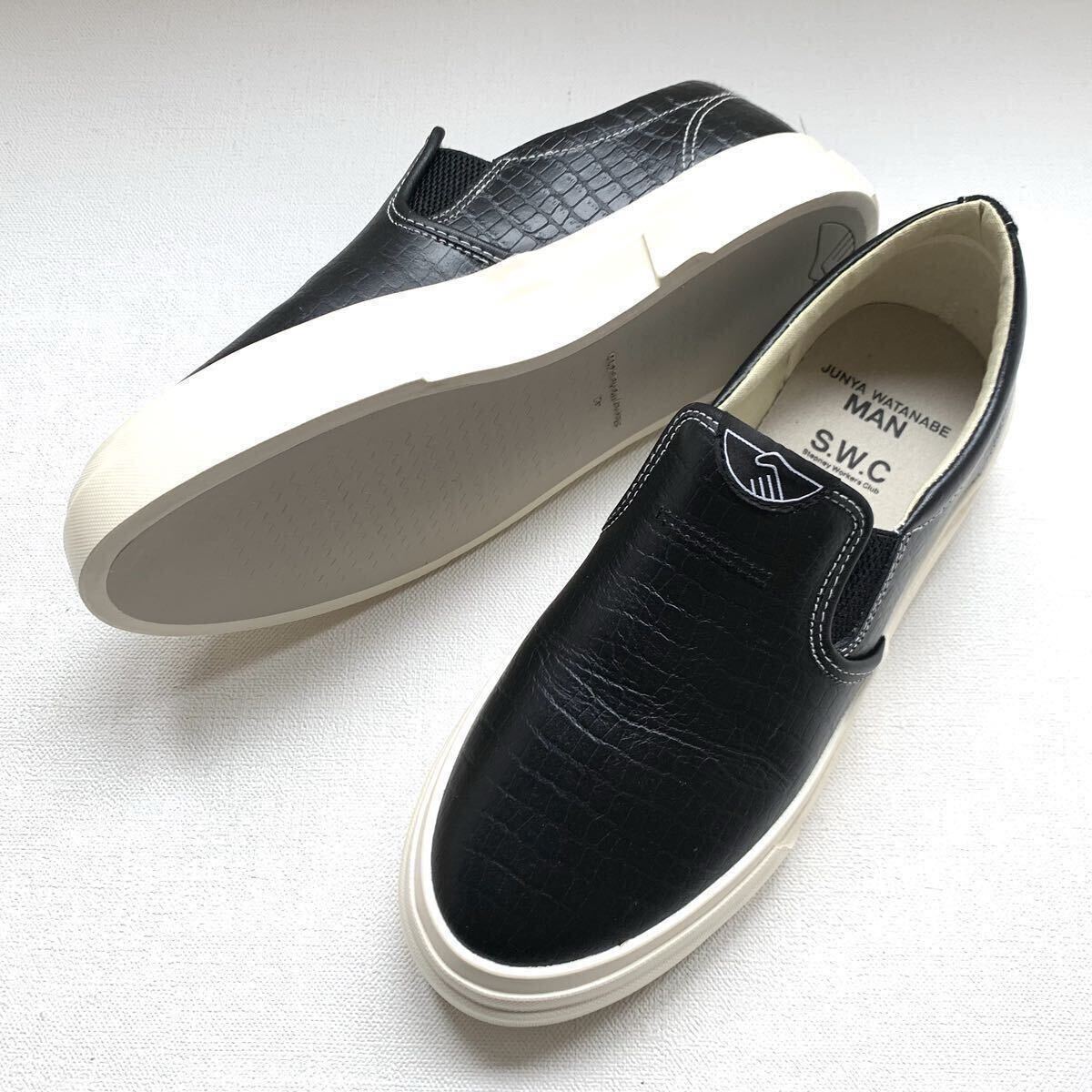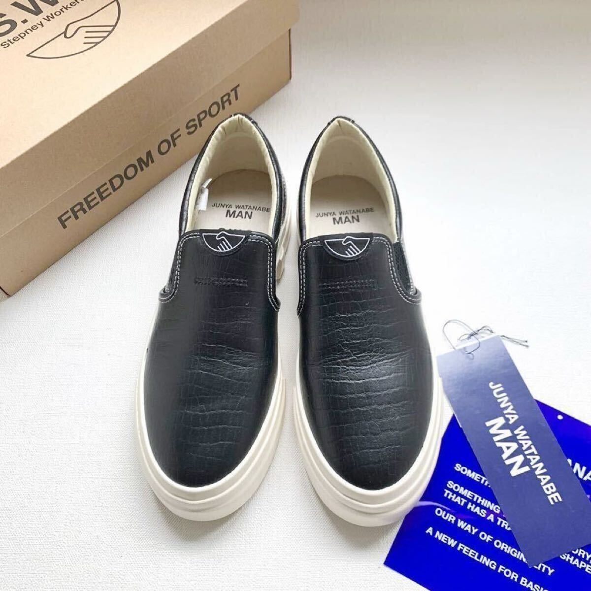 Junya Watanabe MANの2023年秋冬コレクションからStepney Workers Clubステップニーワーカーズクラブとのコラボレーションによるステア型押し スリッポン スニーカー。Stepney Workers Clubの定番スリッポン をベースに、クロコダイルの型押しレザーをアッパーに採用したJunya Watanabe MANらしいクラシックな美意識が感じられる一足。ボリュームのあるソールの左足のヒール部分には、JW MANのロゴがあしらわれています。