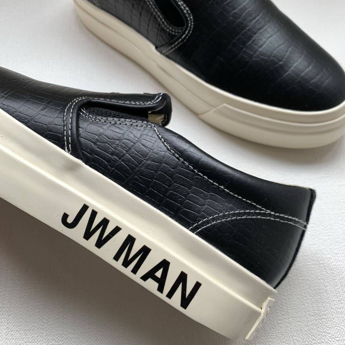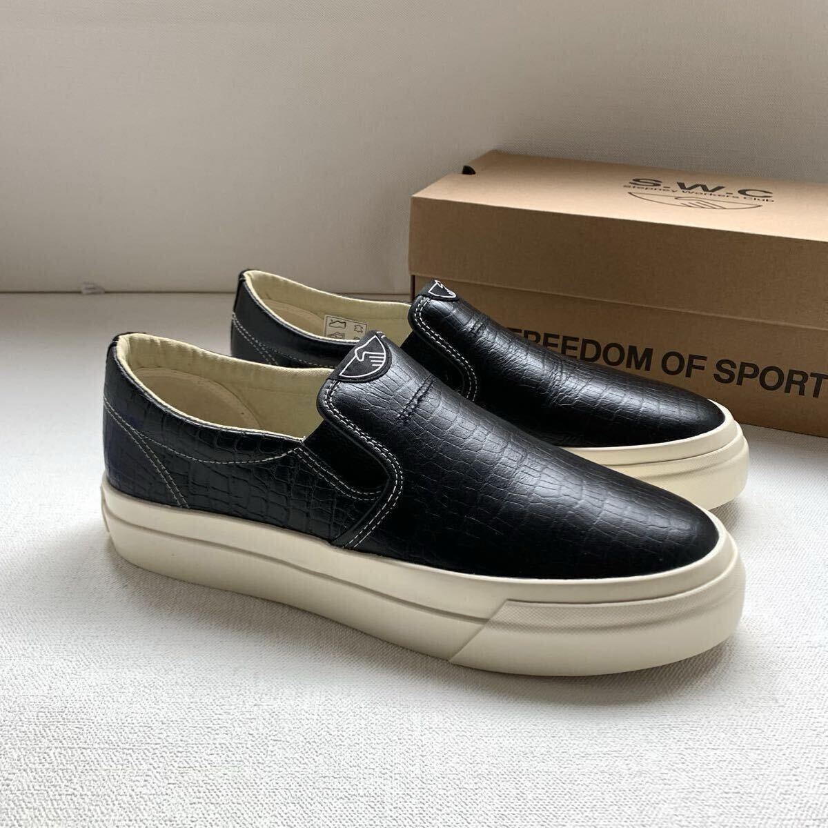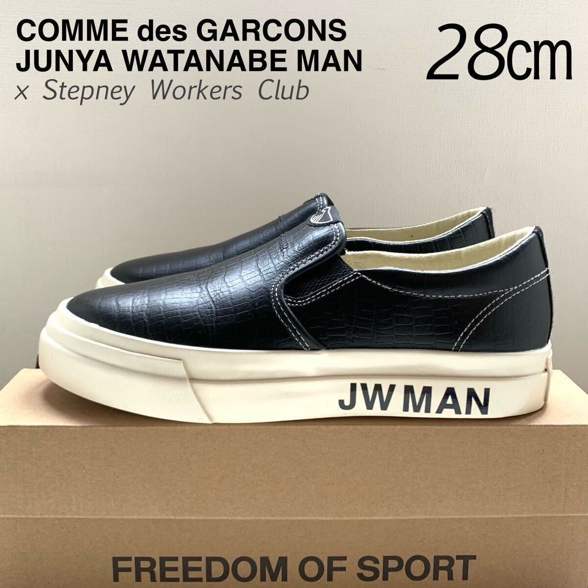 Junya Watanabe MANの2023年秋冬コレクションからStepney Workers Clubステップニーワーカーズクラブとのコラボレーションによるステア型押し スリッポン スニーカー。Stepney Workers Clubの定番スリッポン をベースに、クロコダイルの型押しレザーをアッパーに採用したJunya Watanabe MANらしいクラシックな美意識が感じられる一足。ボリュームのあるソールの左足のヒール部分には、JW MANのロゴがあしらわれています。