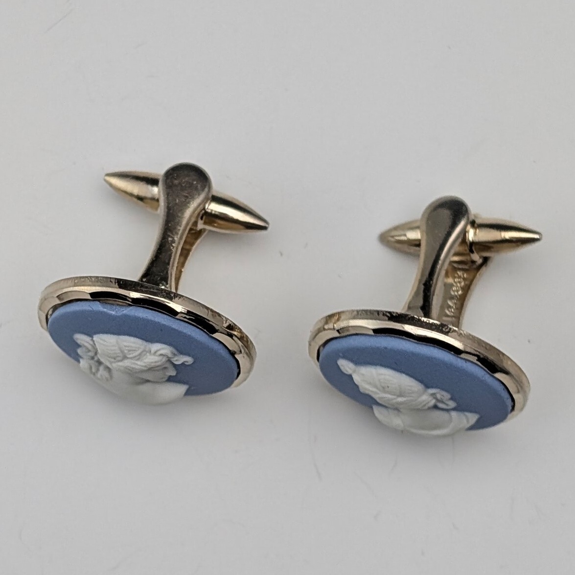ゴールドプレートの土台に、ウェッジウッドブルーのストーンウェアによる女神のカメオデザインのカフリンクスです。