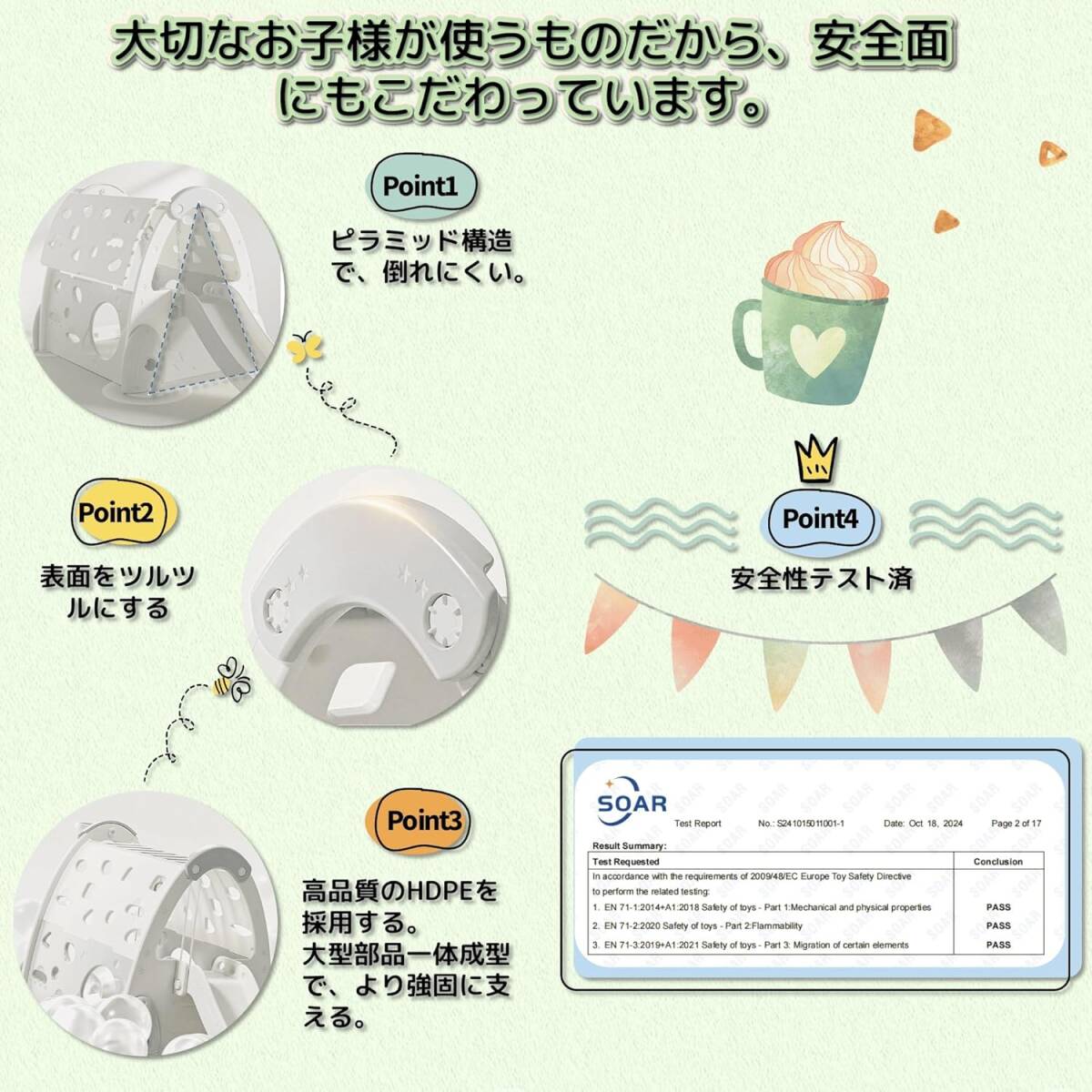 • 【大切なお子様が使うものだから、安全面にもこだわっています。】Point1ピラミッド構造で、倒れにくい。Point2表面をツルツルにするPoint3高品質のHDPEを採用する。大型部品一体成型で、より強固に支える。Point4 安全性テス卜済