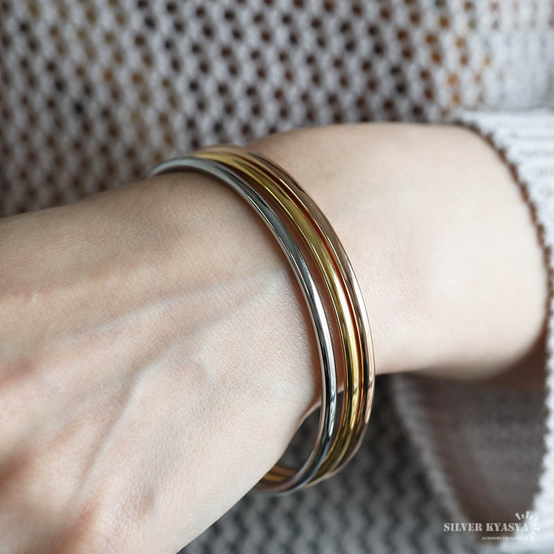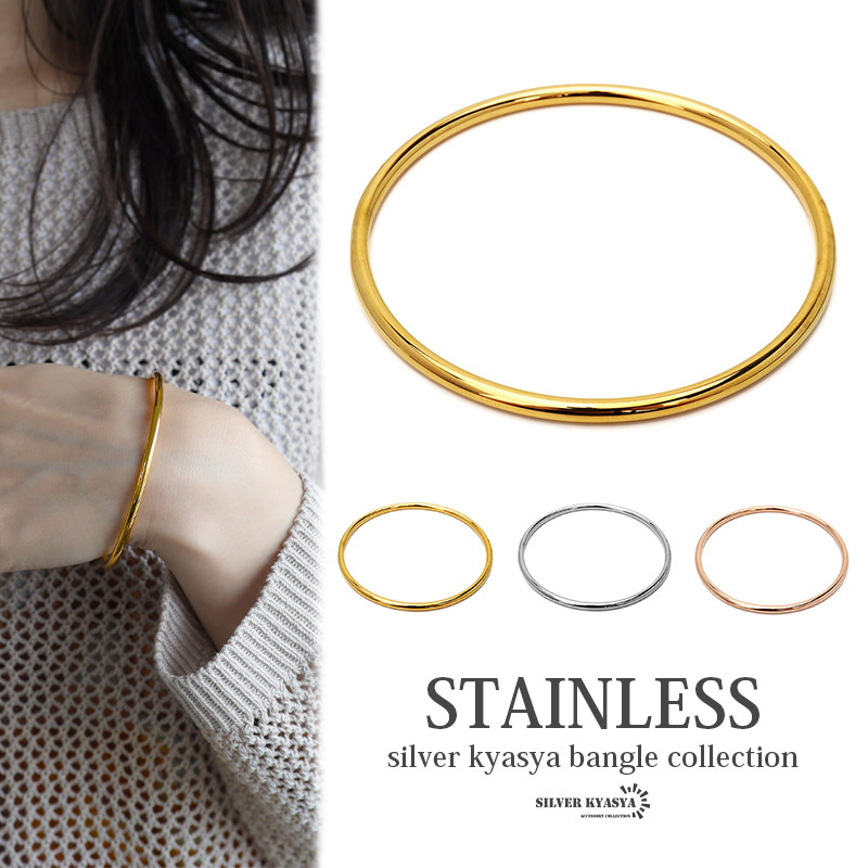 商品概要 | ■ITEM DESIGN ステンレスを使用したシンプルバングル。高品質、高性能、メッキも剥がれにくいバングルで付けっぱなしもOK!オールシーズン使えるマストアイテム。 ■ステンレス素材を使用 金属部分は頑丈なことで知られるステンレス素材を採用。耐久性はもちろん耐水性も高く水場での着用も可能。金属アレルギーも出にくいとされている金属です。 |