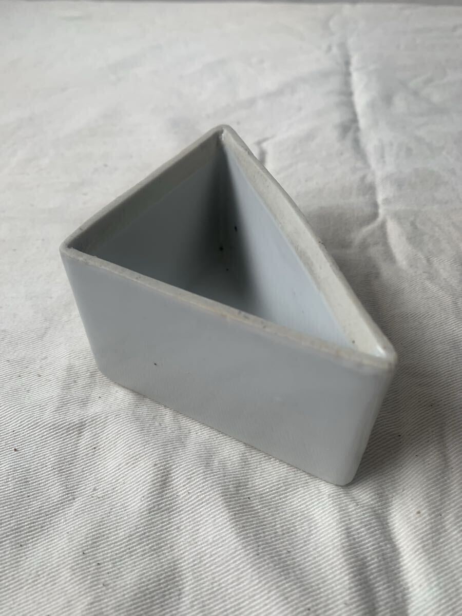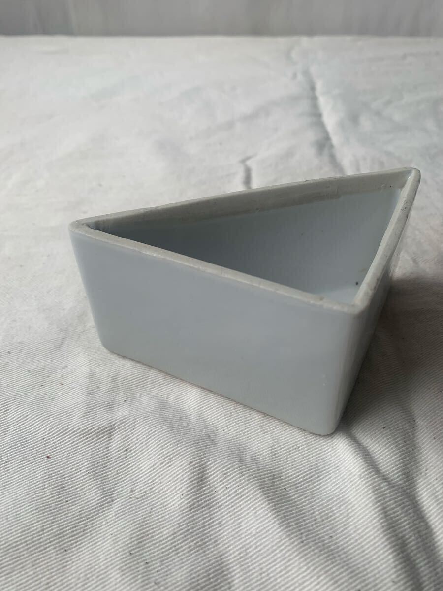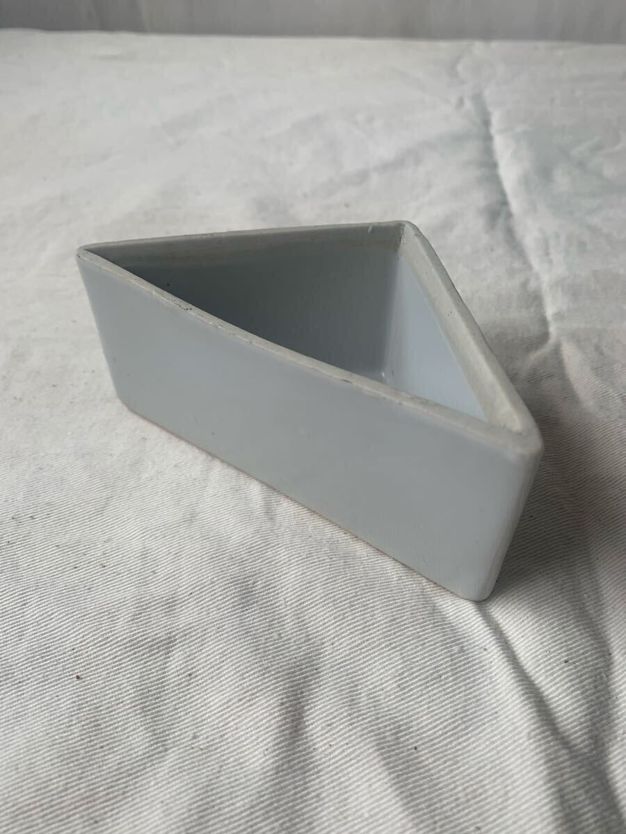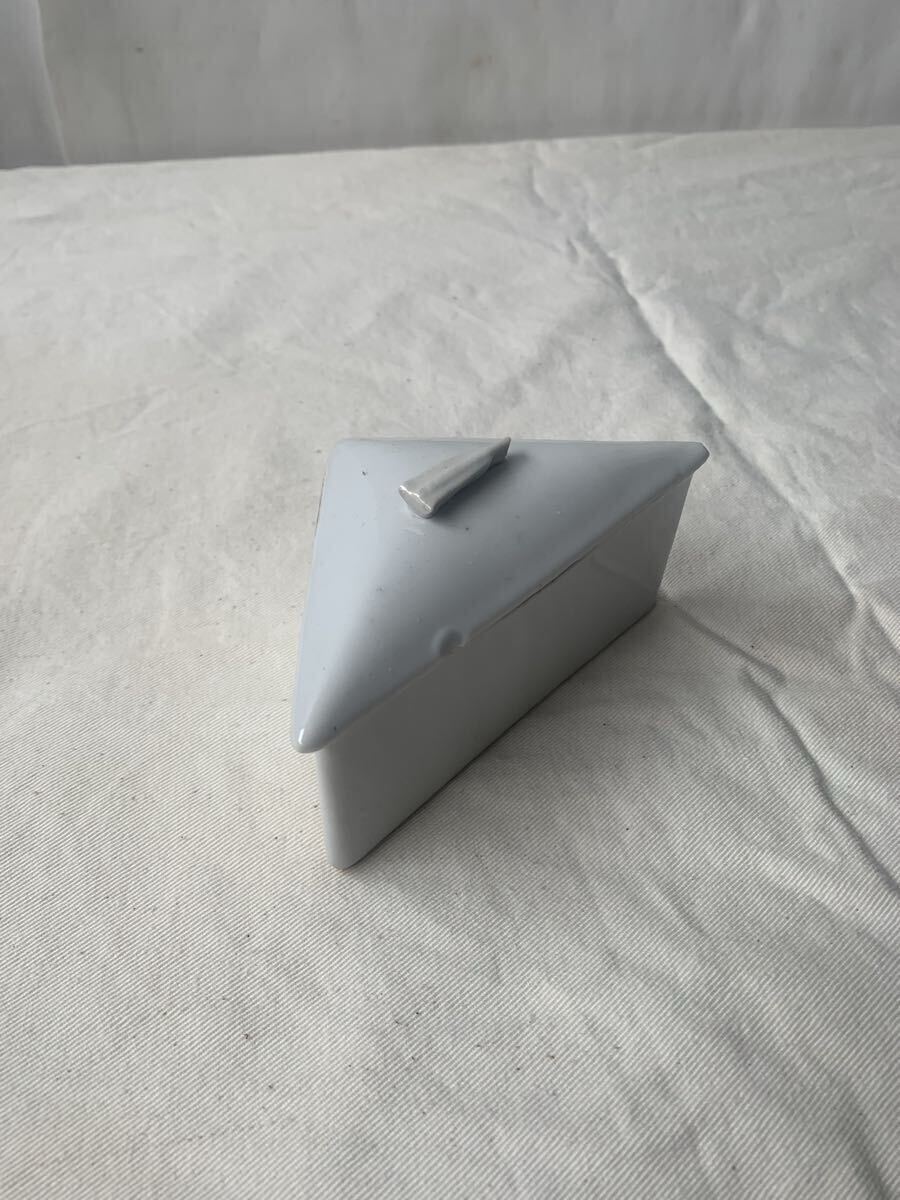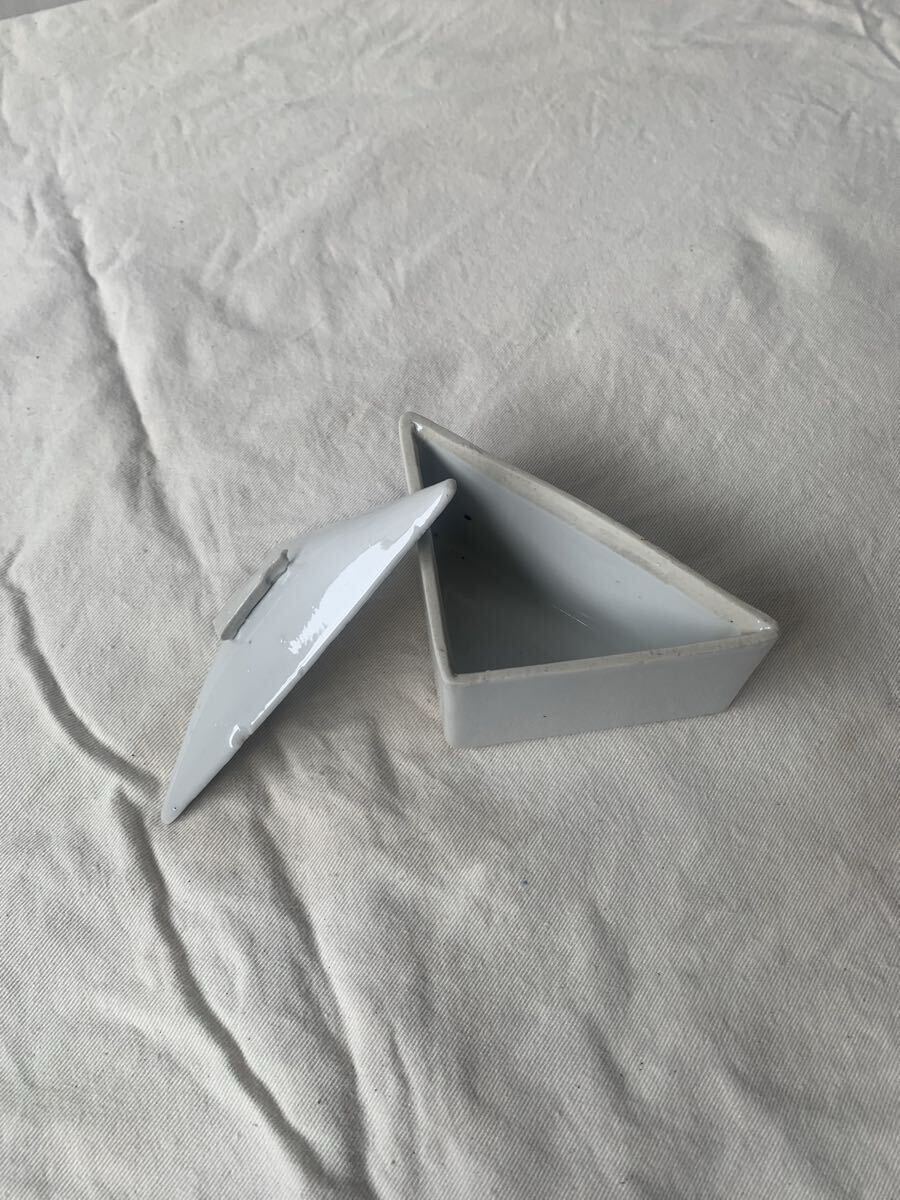 デザインが素敵な蓋付三角形白磁ケースです。小物やアクセサリーなどを飾るお部屋のインテリアやお店のディスプレイ、イベント出店時の什器などに使って頂いても素敵だと思います。