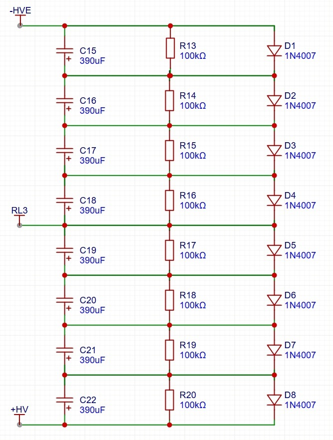 本製品は既設の平滑回路と互換性があり、プリント基板に105℃対応・寿命5000時間の NICHICON製 390 μF / 500V コンデンサ を実装しています。各コンデンサには、5Wの酸化金属皮膜抵抗器および1N4007ダイオードが並列接続されており、逆極性からの保護とともに、意図しない短時間の電圧変動やノイズからの保護を実現しています。また、これにより最小限の熱で比較的速やかな電圧放電が可能です。
