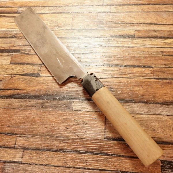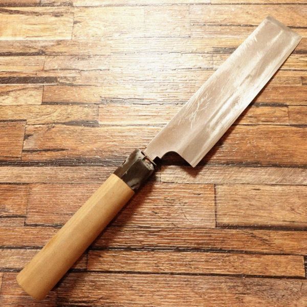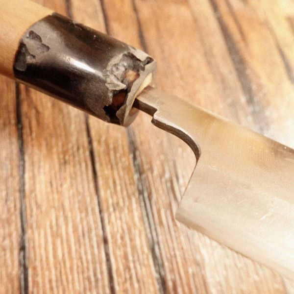 薄刃包丁は、野菜の桂剥きや飾り切りなど、繊細な作業に適した和包丁です。水牛柄に虫食いが見られますが使用には問題ないかと思います。お値段には反映しておりますので気にされない方はお買い得ですね。和包丁ですので柄を取り換えるのも比較的簡単ですので、取り替えてもよいでしょう。