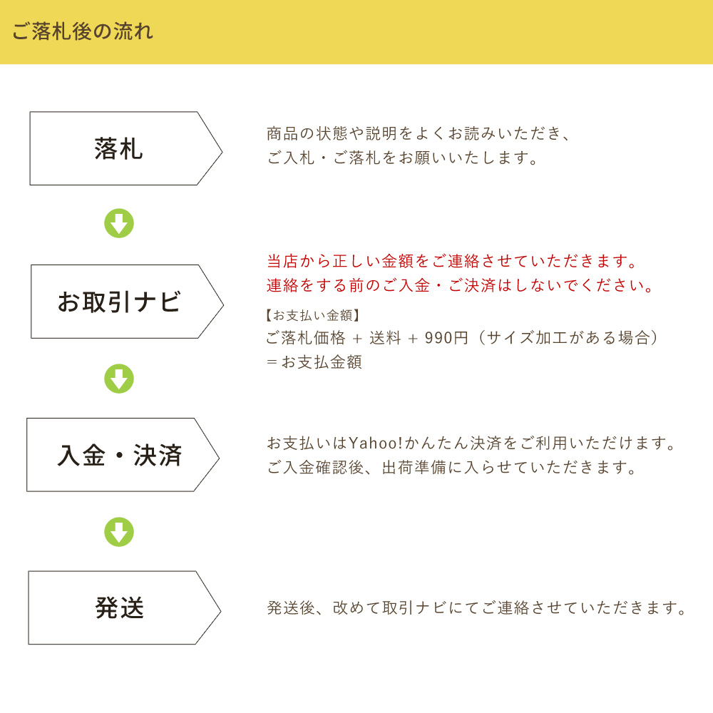 | お支払い方法 | Yahoo!かんたん決済(詳細) ご落札後、取引ナビにて総額をお知らせ致します。 こちらからの連絡前にご入金、ご決済はしないようにお願いいたします。 |