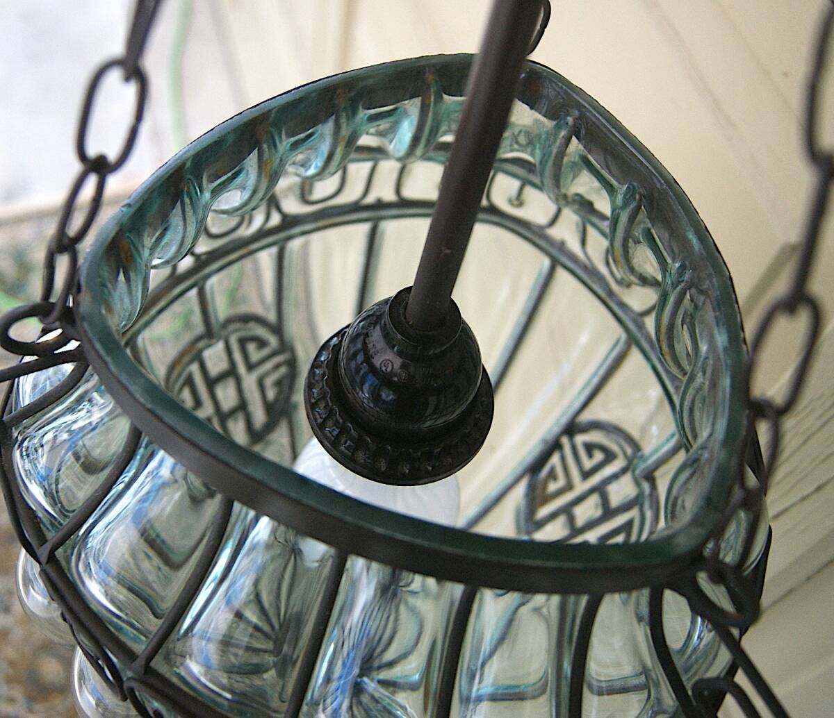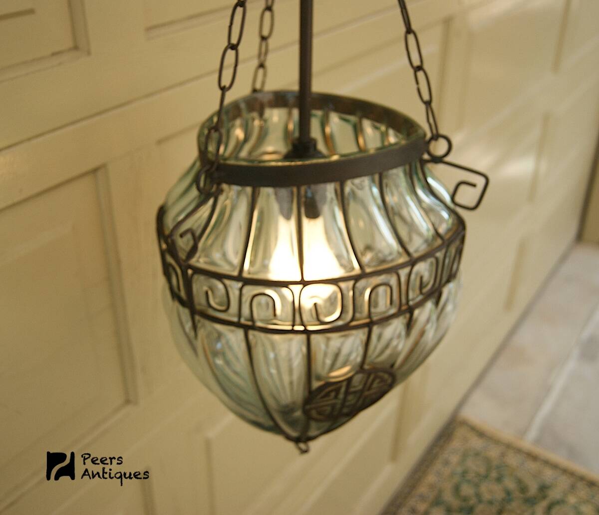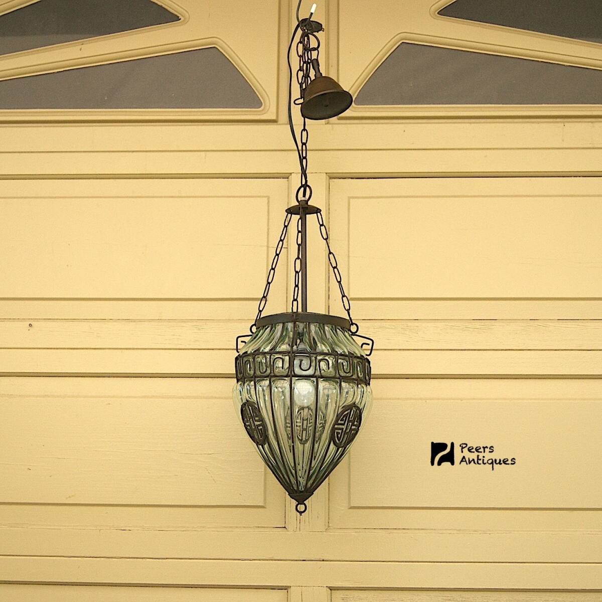 6314p【アイアン フレーム 吹きガラス グリーン ハンギング ランプ ペンダントライト E27球】ムラーノガラス 作家物 一点物 シャンデリア ヴィンテージ◎
