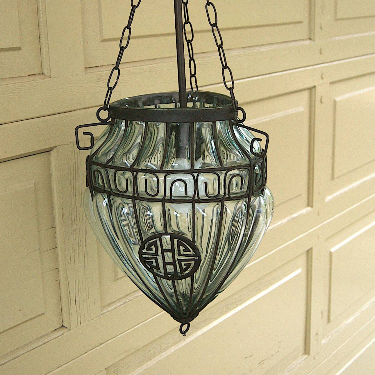 6314p【アイアン フレーム 吹きガラス グリーン ハンギング ランプ ペンダントライト E27球】ムラーノガラス シャンデリア ヴィンテージ◎