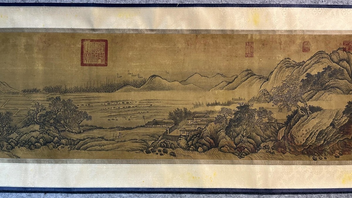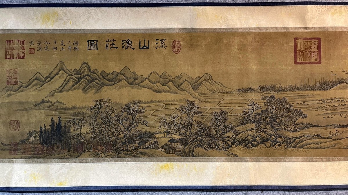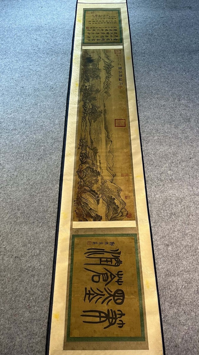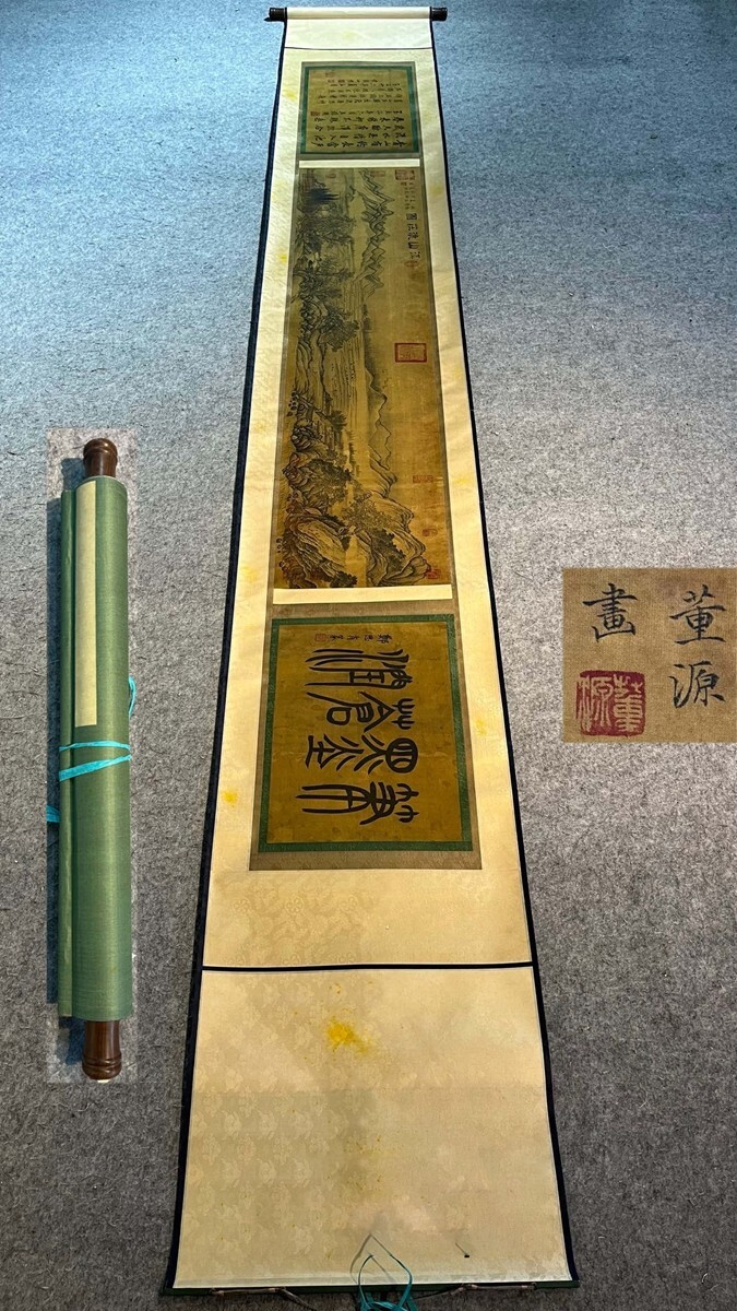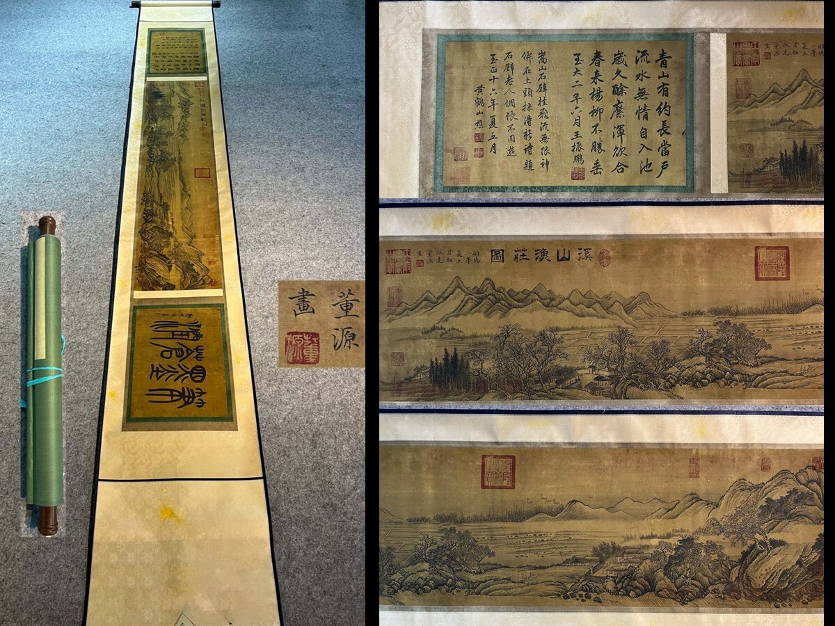 中国書画「五代 董源 山水図長巻」肉筆絹本 掛け軸 墨寶妙品 書画横軸 巻き物 古美術 旧蔵出