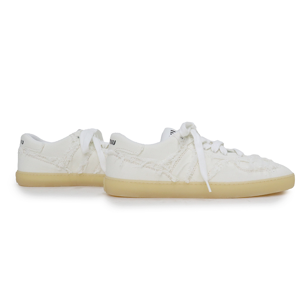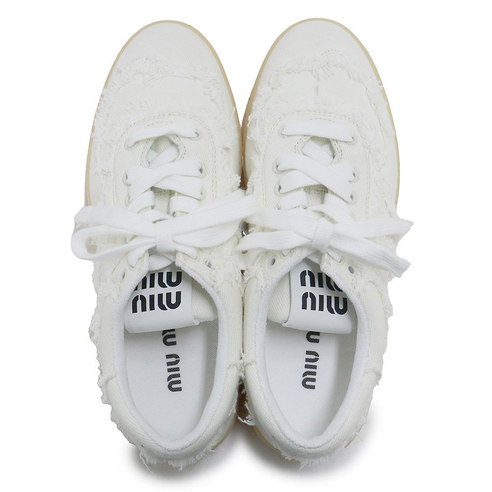 (新品・未使用品)ミュウミュウ miu miu ウォッシュド デニム フリンジ ロゴ スニーカー 靴 #37.5 24.5cm コットン ホワイト 5E325E 箱付